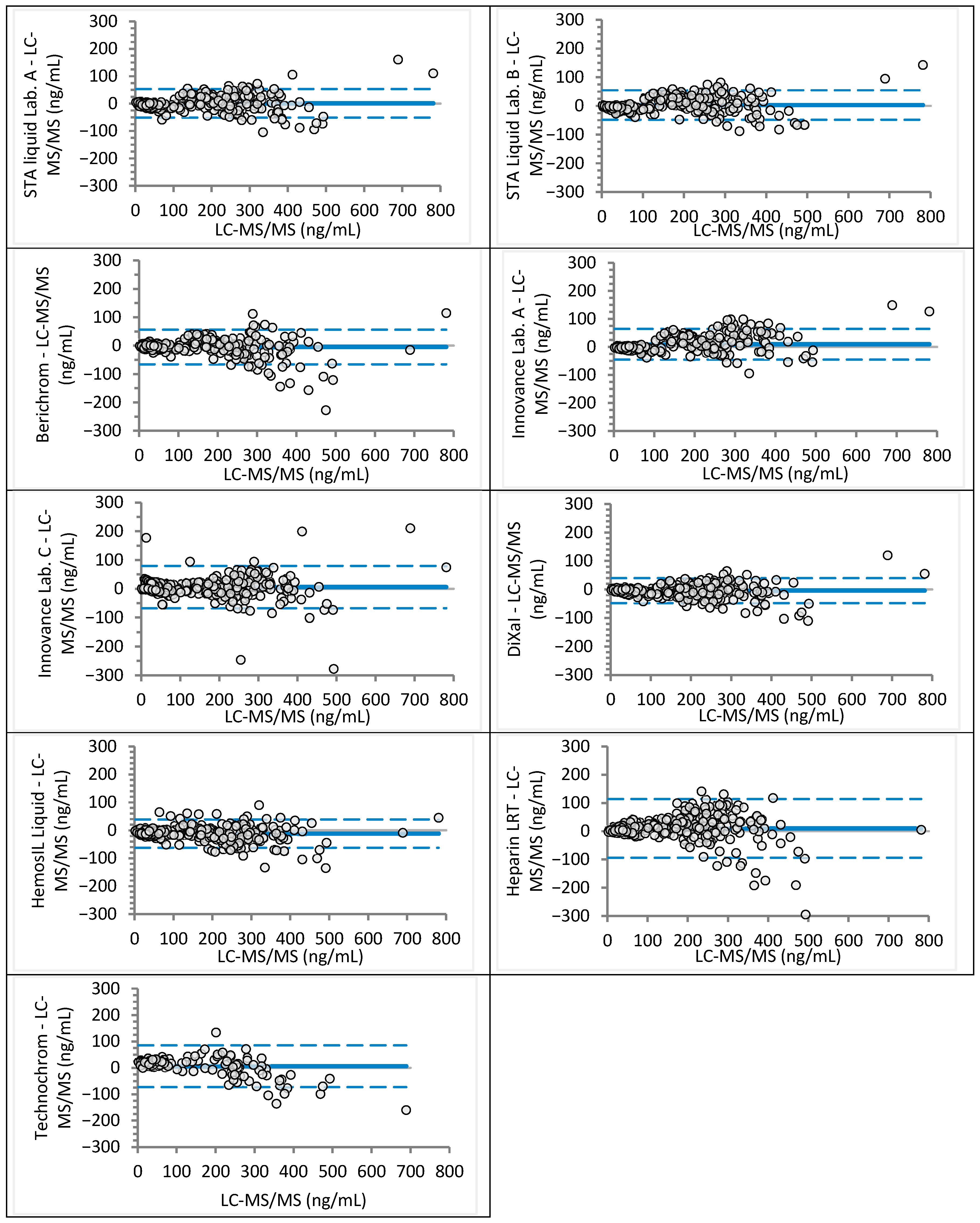 | Berichrom Heparin (Siemens Healthineers, Marburg, Germany) | STA-Apixaban Calibrator, STA-Apixaban Control (Diagnostica Stago) | |||