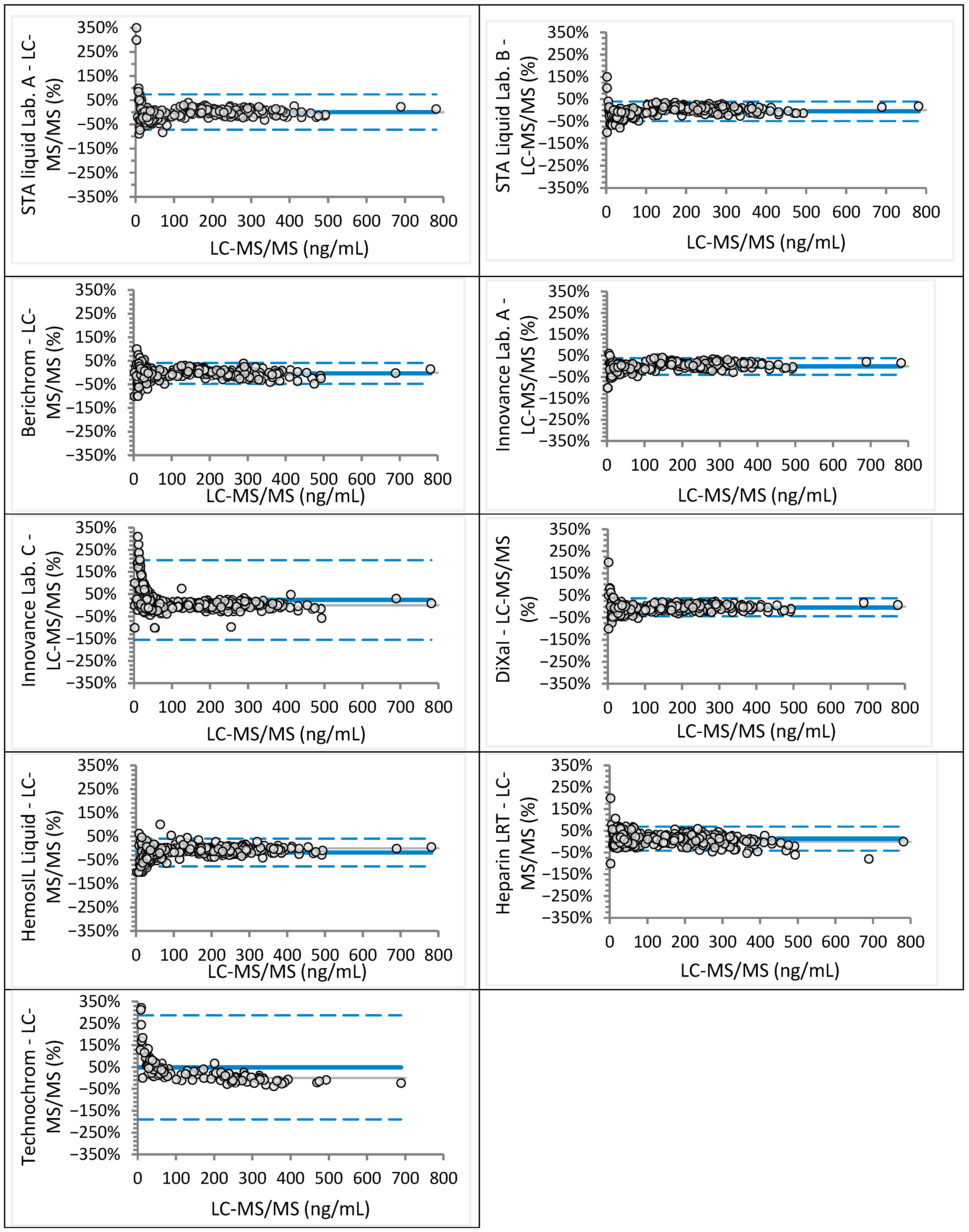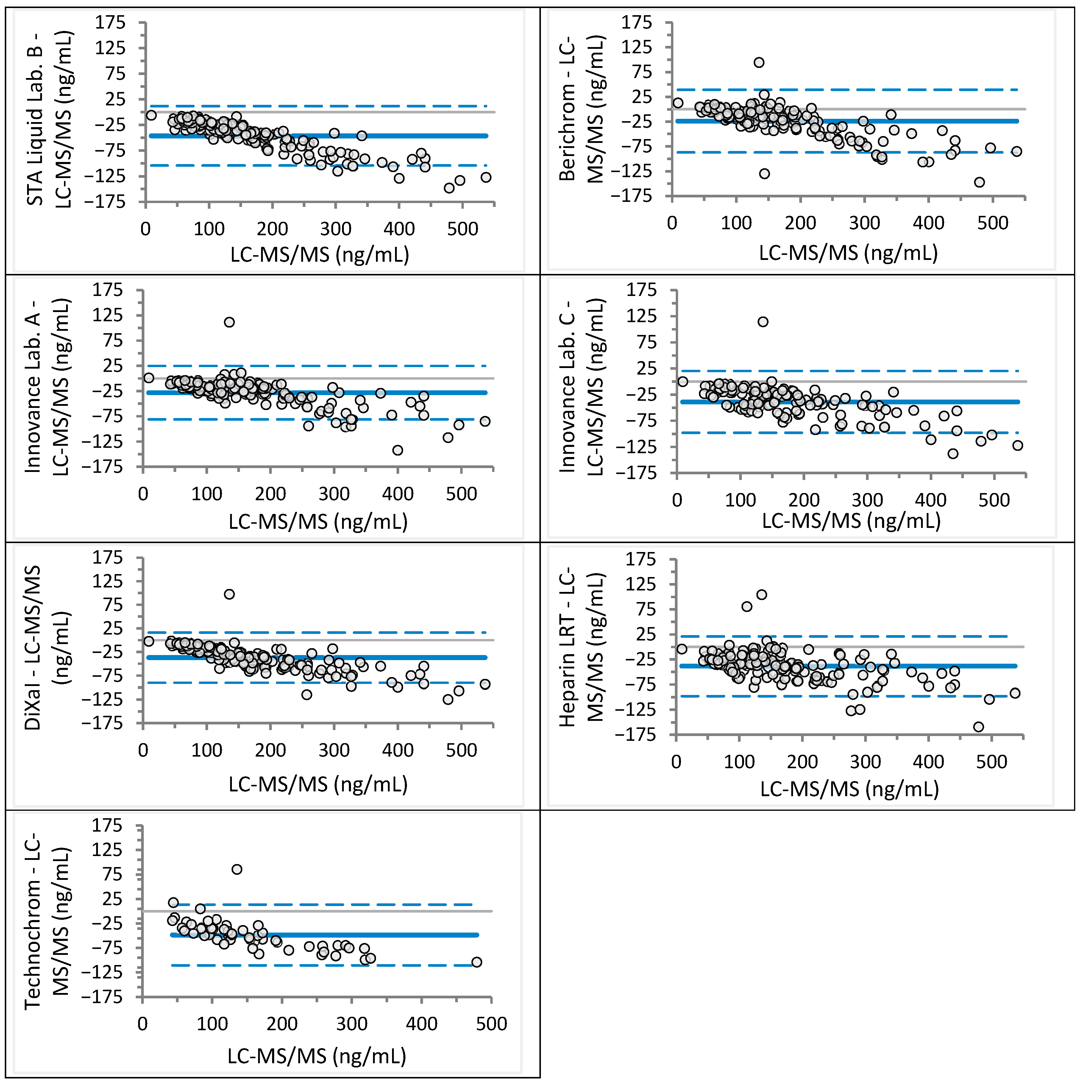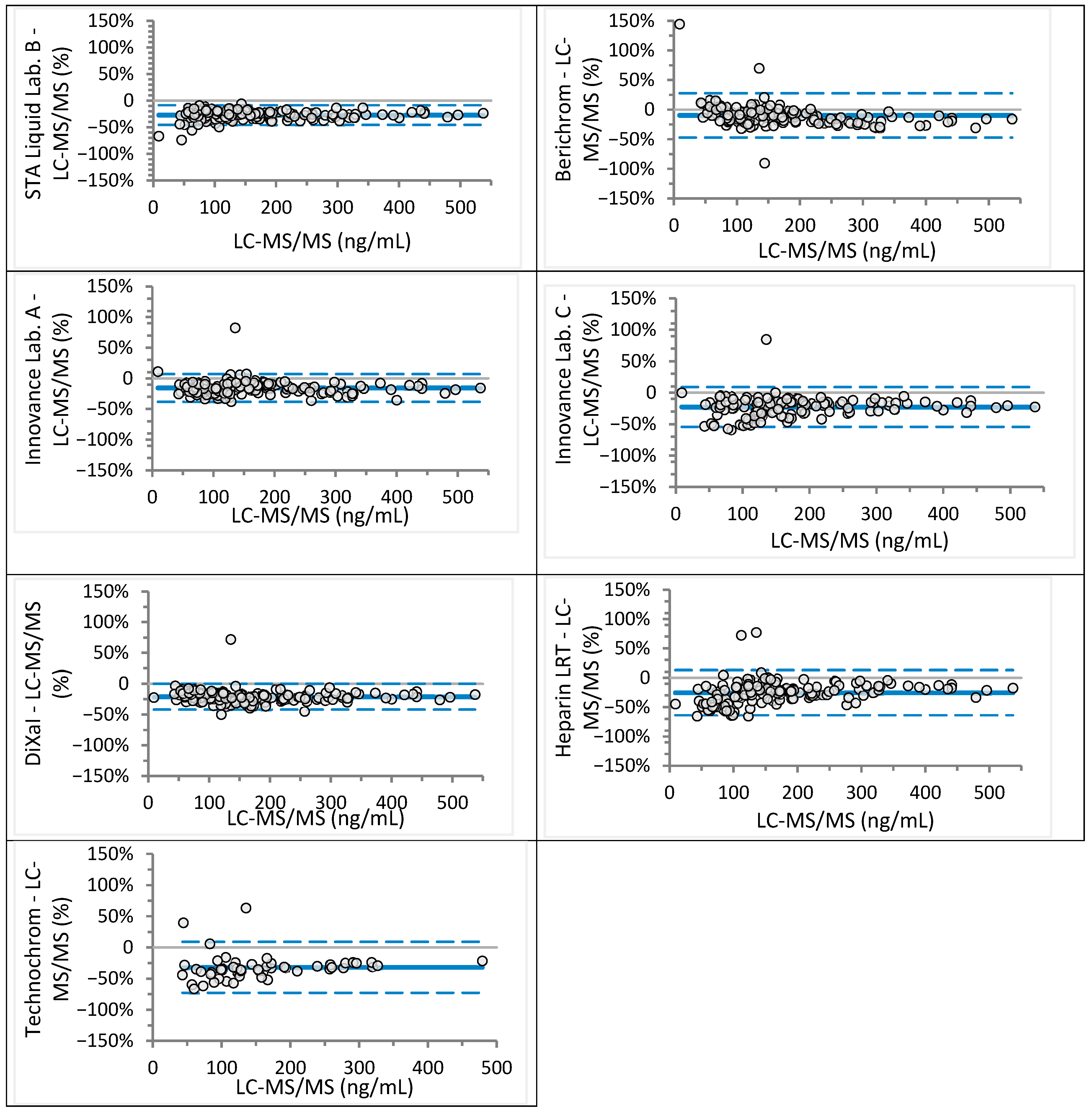 | Heparin LRT | y = 1.11x + 1.30 | 1.07 to 1.14 | −0.05 to 3.39 | 34–36 | 56–59 |