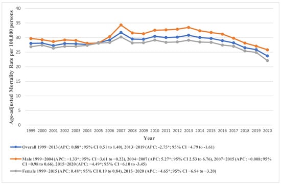 National trends in overall and sex-specific age-adjusted mortality rates due to AS in the United States from 1999 to 2020; * denotes years in which the annual percentage change (APC) differed significantly from 0 at α = 0.05.