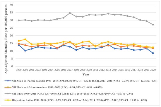 Age-adjusted mortality rates attributable to AS across racial/ethnic groups in the United States from 1999 to 2020; * denotes years in which the annual percentage change (APC) differed significantly from 0 at α = 0.05.