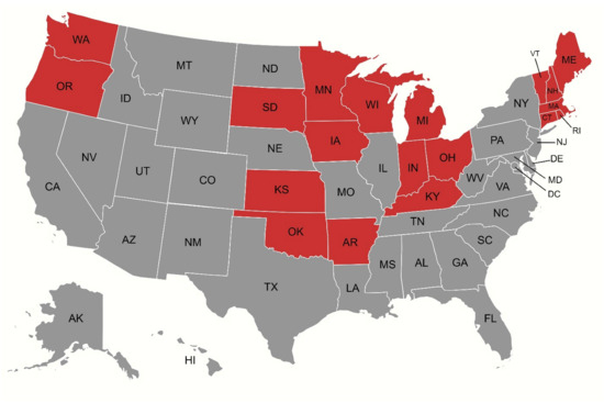 - Ingram, D.D.; Franco, S.J. 2013 NCHS Urban-Rural Classification Scheme for Counties; US Department of Health and Human Services: Washington, DC, USA, 2014; pp. 1–73. [Google Scholar] [PubMed]
