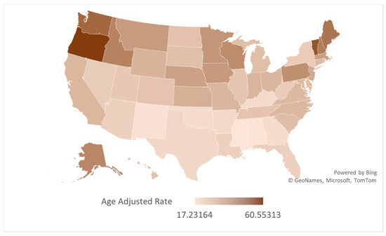 Map depicting state-wise variations in AS-associated AAMRs in older adults per 100,000 in the United States, 1999 to 2020.