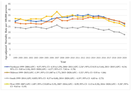 Age-adjusted mortality rates attributable to AS across regions in the United States from 1999 to 2020; * denotes years in which the annual percentage change (APC) differed significantly from 0 at α = 0.05.