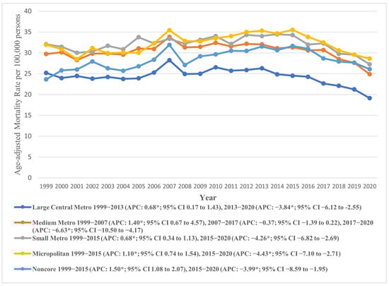 Age-adjusted mortality rates attributable to AS across urban and rural populations in the United States from 1999 to 2020; * denotes years in which the annual percentage change (APC) differed significantly from 0 at α = 0.05.