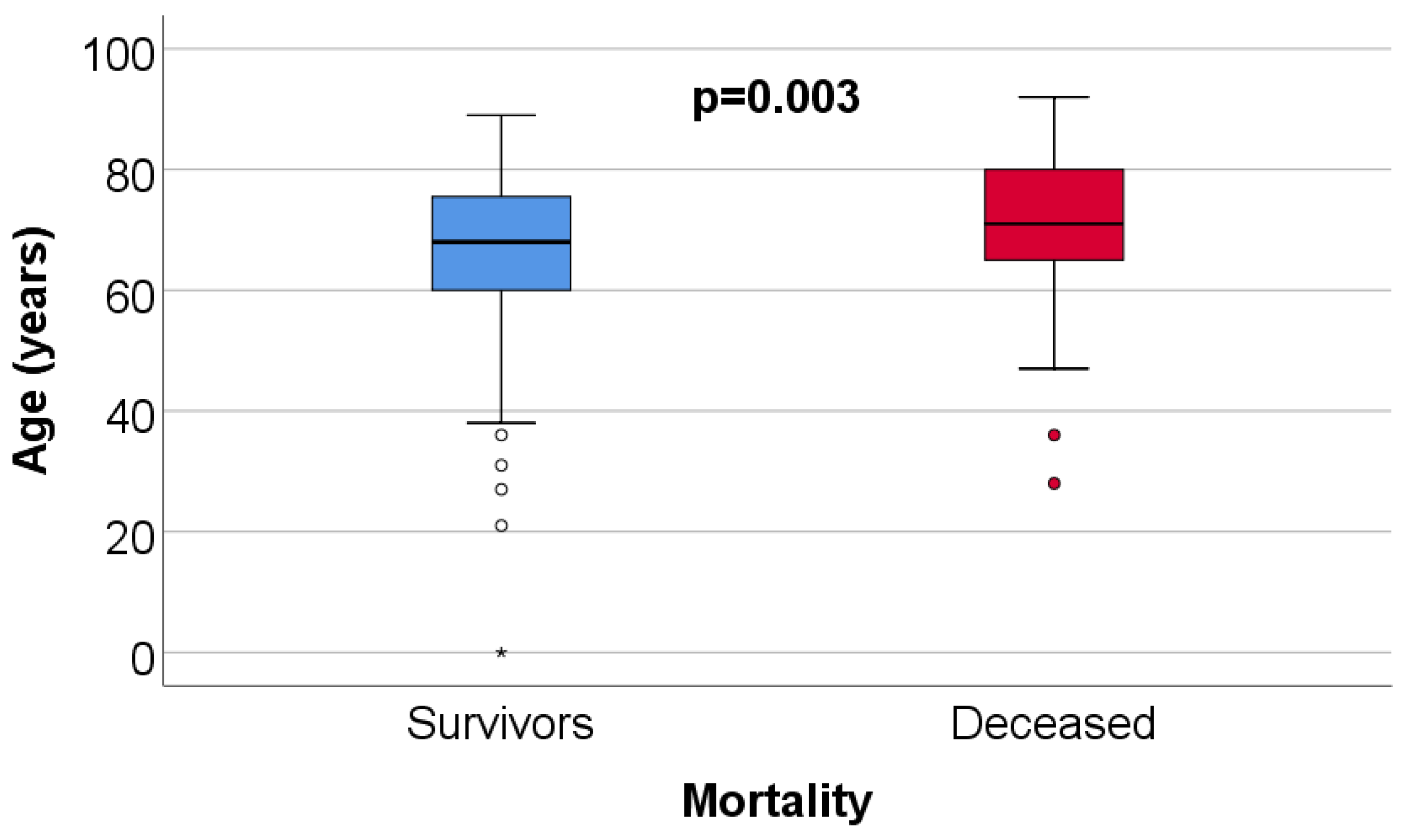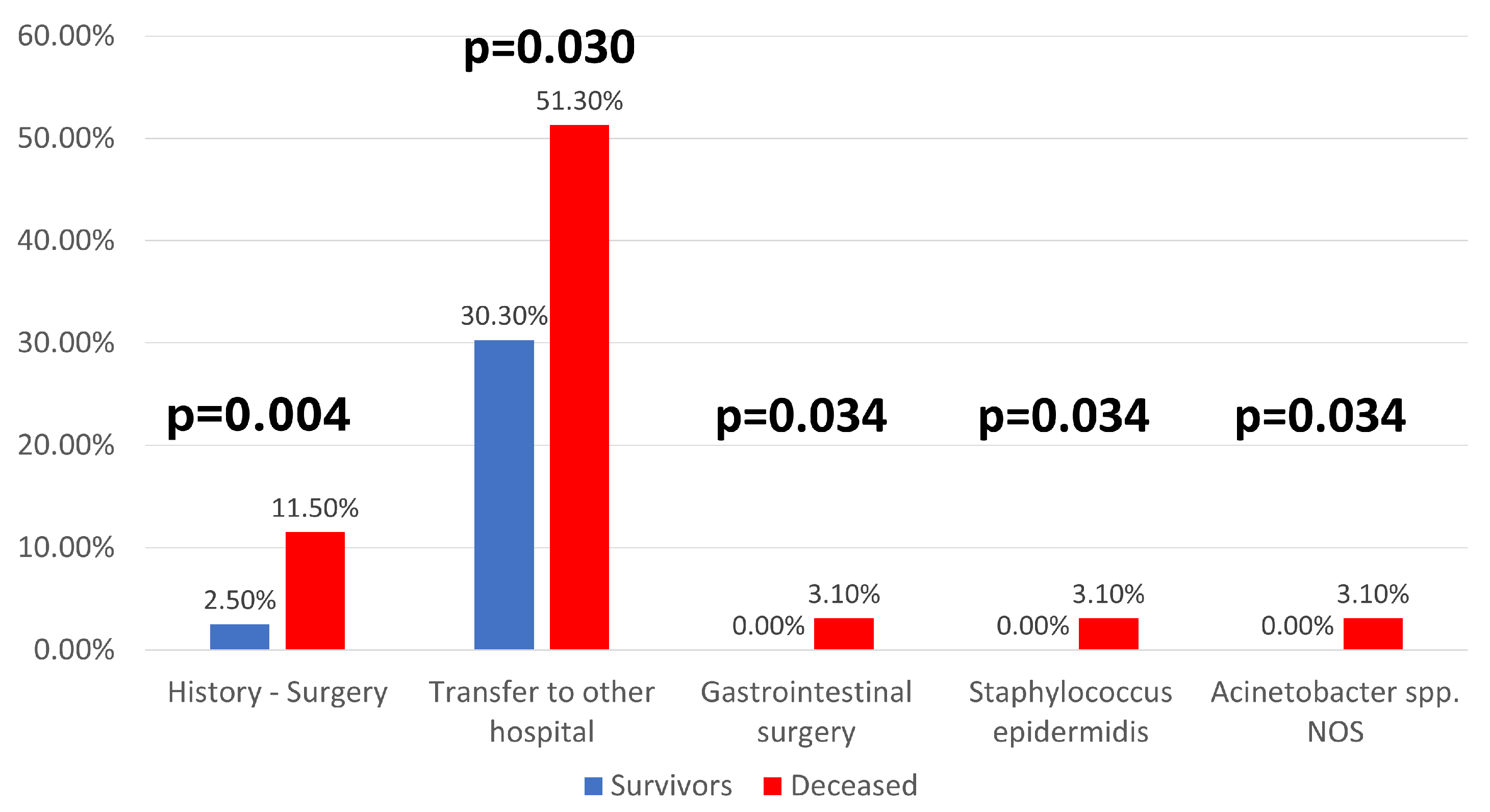 | Parameter (No., %) | Total | Survivors | Deceased | p |