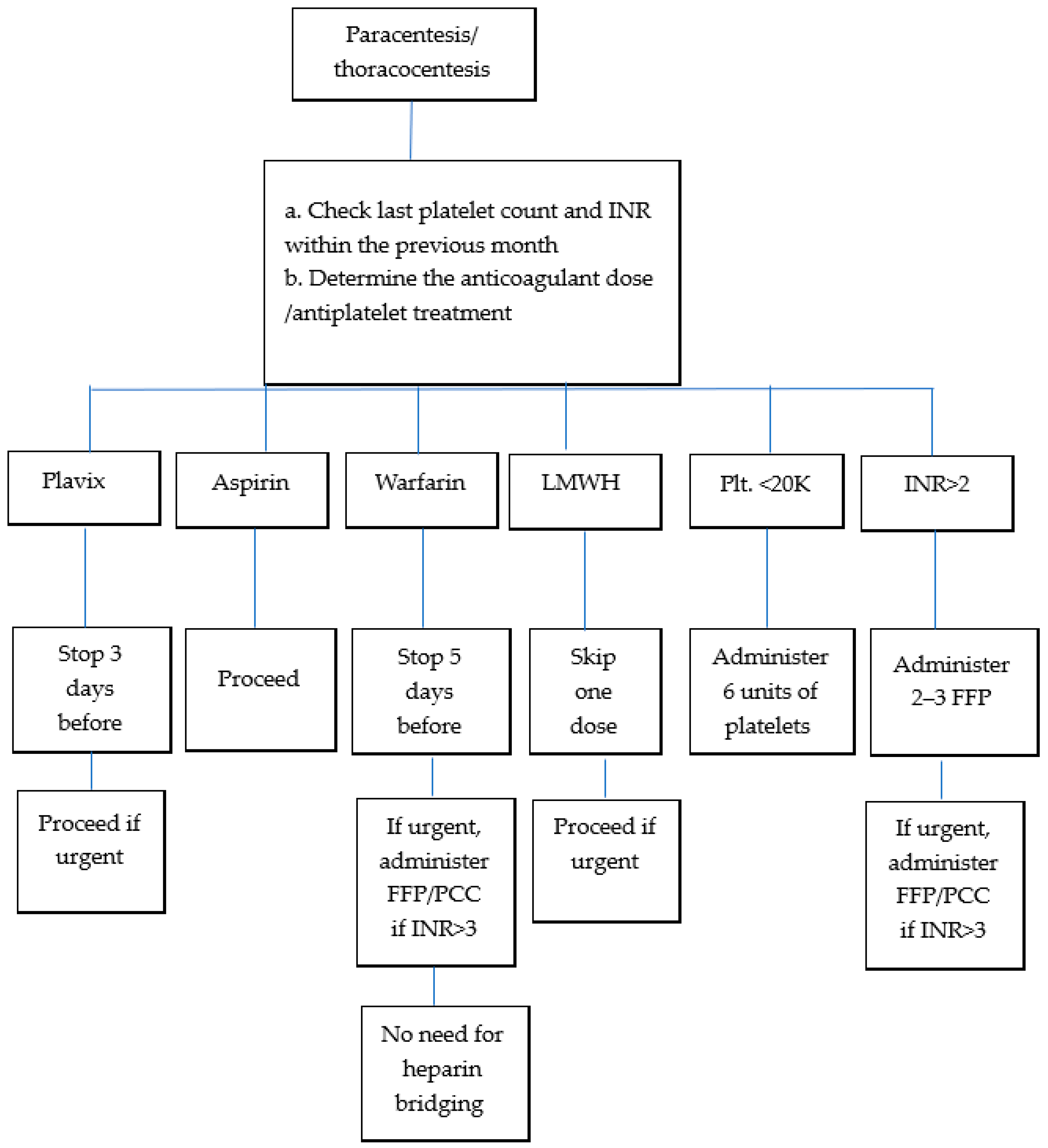 | 4. Coagulation guidance | No repeat tests if no coagulopathy history and normal test results in the past month. a. DOACs: Stop 24 h prior (skip one dose). Proceed if emergency drainage required. b. Warfarin: Stop 5 d prior; confirm INR < 2.0. If emergency, correct with FFP/PCC above INR-3.0. c. Clexane (LMWH): Hold 12 h (skip last dose). Proceed if emergency drainage required. d. Aspirin: proceed. e. Plavix: Stop 72 h prior. Proceed if emergency drainage required. f. Platelet count < 20,000/μL: Administer 6 units. g. INR > 2.0: Administer ≤ 3 FFP units. (~0.3 INR correction per unit) [1]. If emergency correct with FFP/PCC above INR-3.0. h. TEG: Optional if available. |
