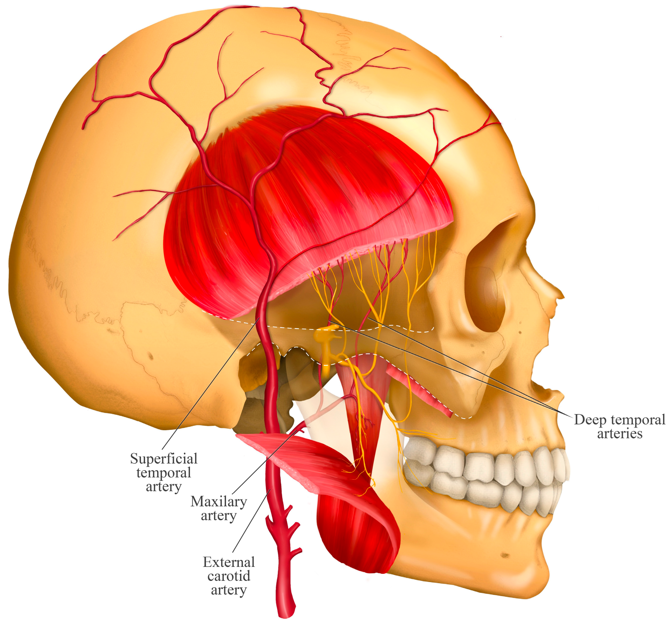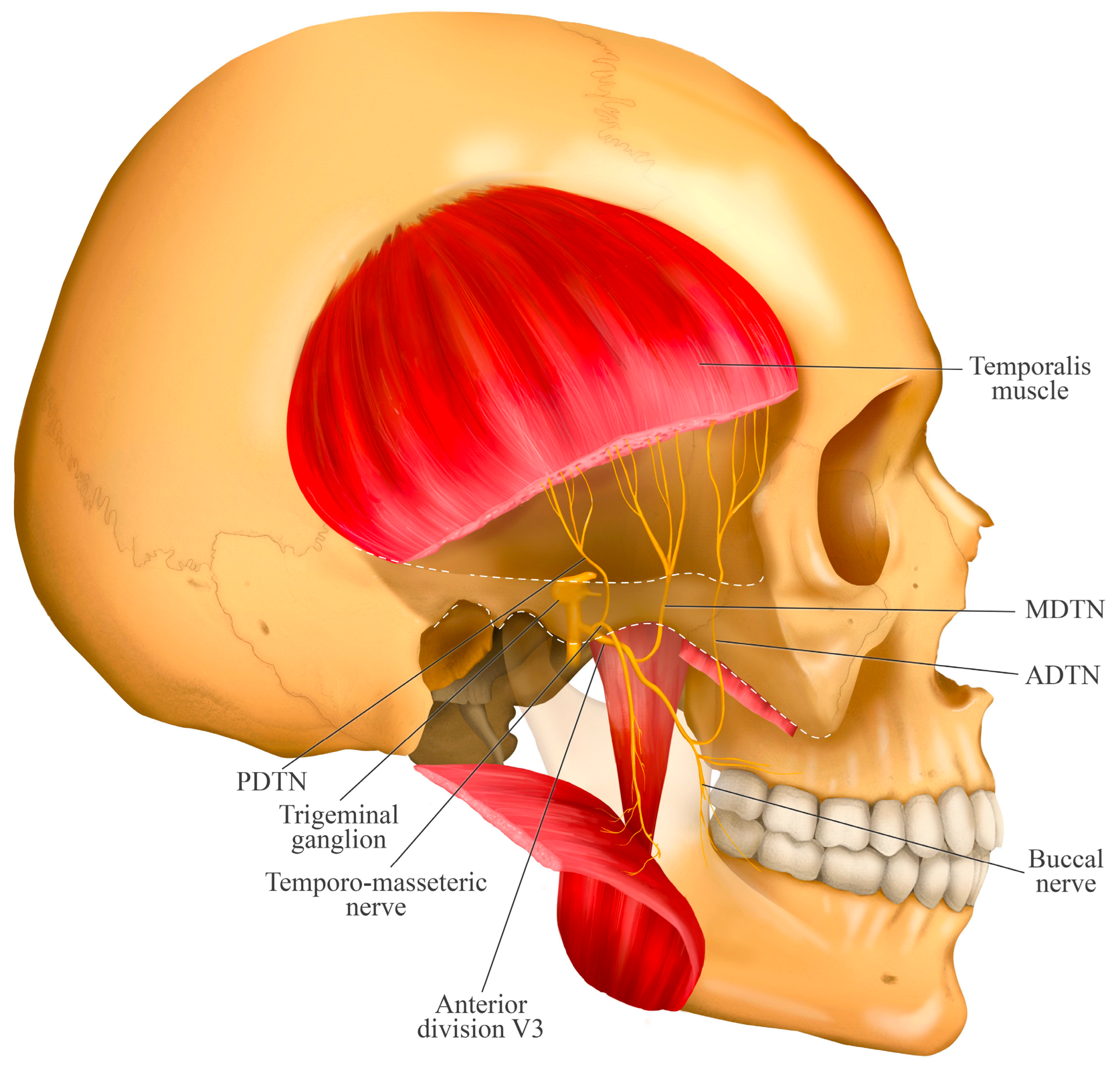 - The posterior deep temporal nerve (PDTN) arises independently from the temporomasseteric nerve. It travels along the superior surface of the upper head of the lateral pterygoid muscle and distributes to the posterior portion of the temporalis muscle [22]. It has also been described as having two to five branches [23].