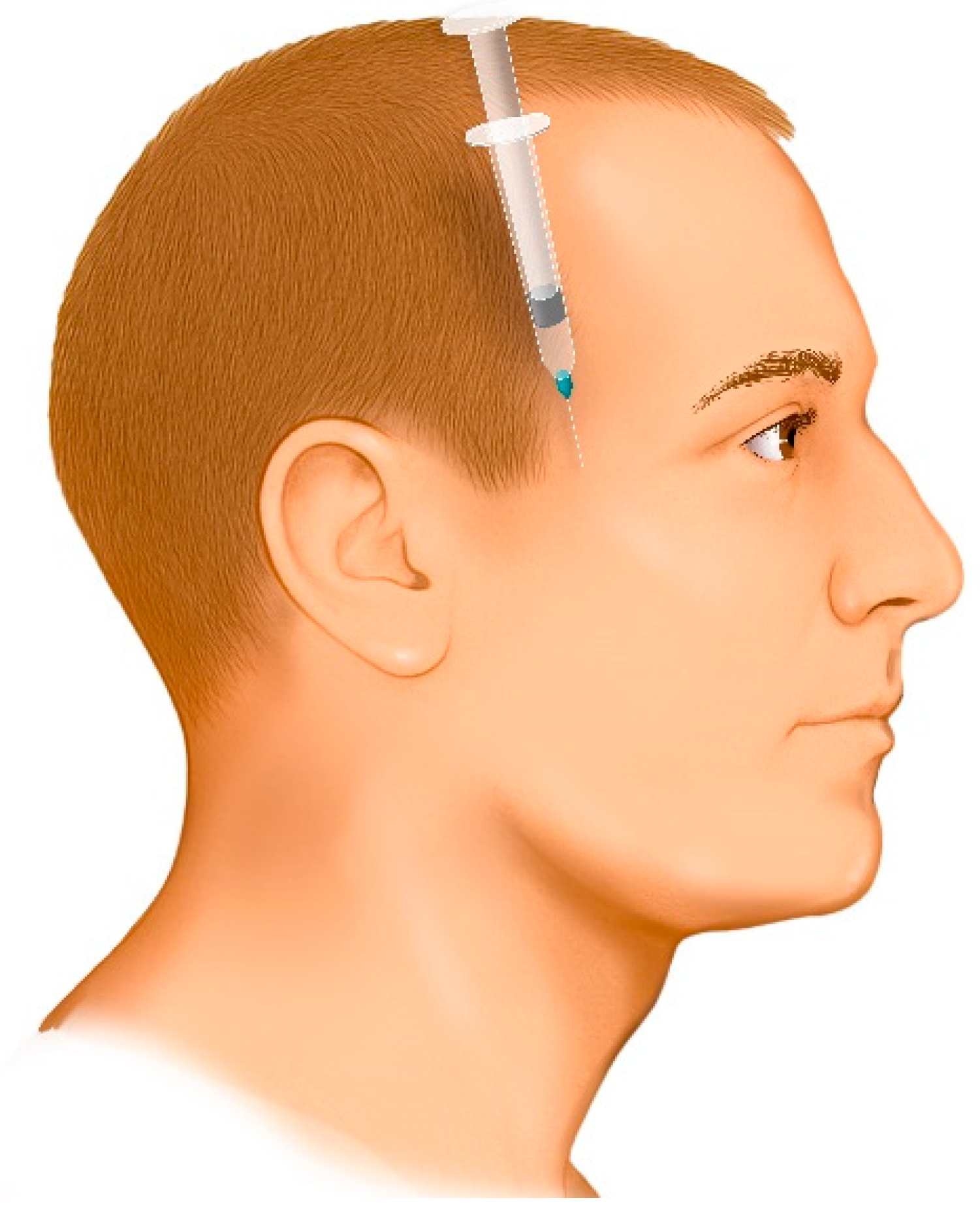 - The needle is directed downward between the zygomatic arch and the infratemporal fossa at an angle of 35° to 45° relative to the cranium (Figure 5). This angulation can be easily achieved by seating the patient in an upright position and aligning the needle to bisect the angle between the temporal bone (vertical plane) and the horizontal plane. If the needle is not angled properly, it may contact the coronoid process of the mandible, obstructing its advance. In such cases, the needle should be withdrawn slightly and redirected at a wider angle.