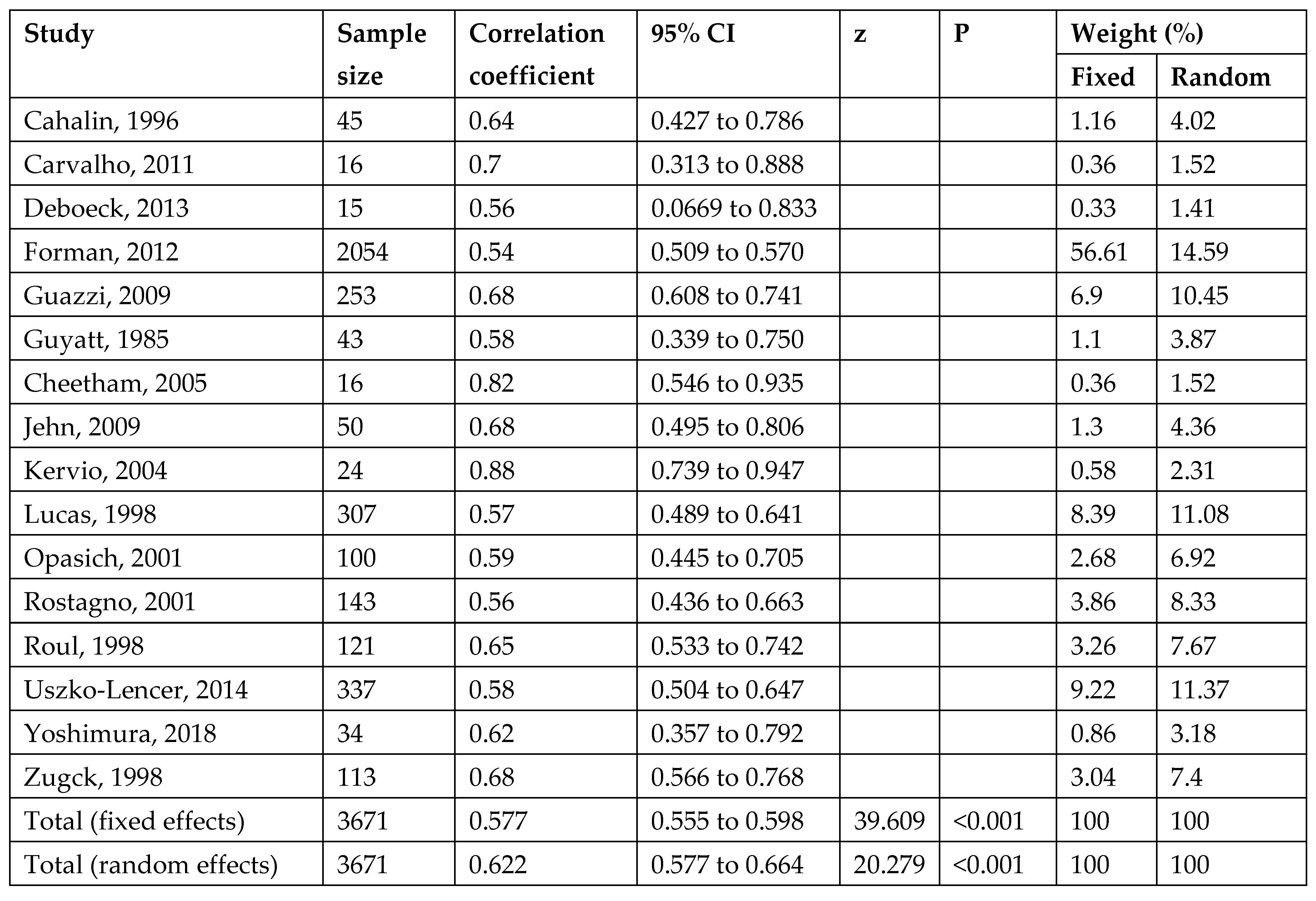 | Omar et al. (2017) [31] USA | I–IV | NR | 30 | 433 Men 320 Women 113 | 56 | NR | NR | NR | NR | r = 0.4 * DW-6MWT/pVO2-CPET | NR |