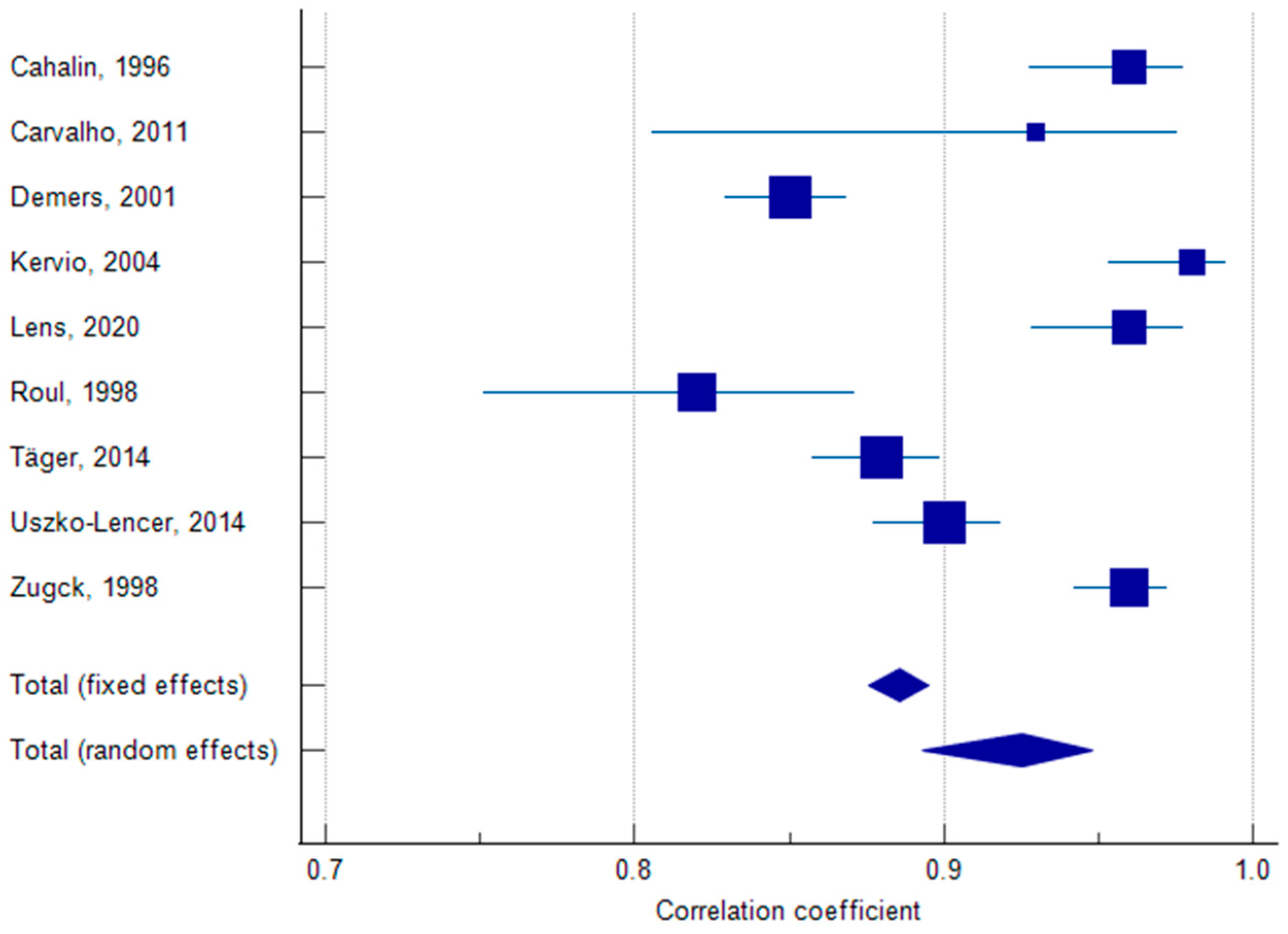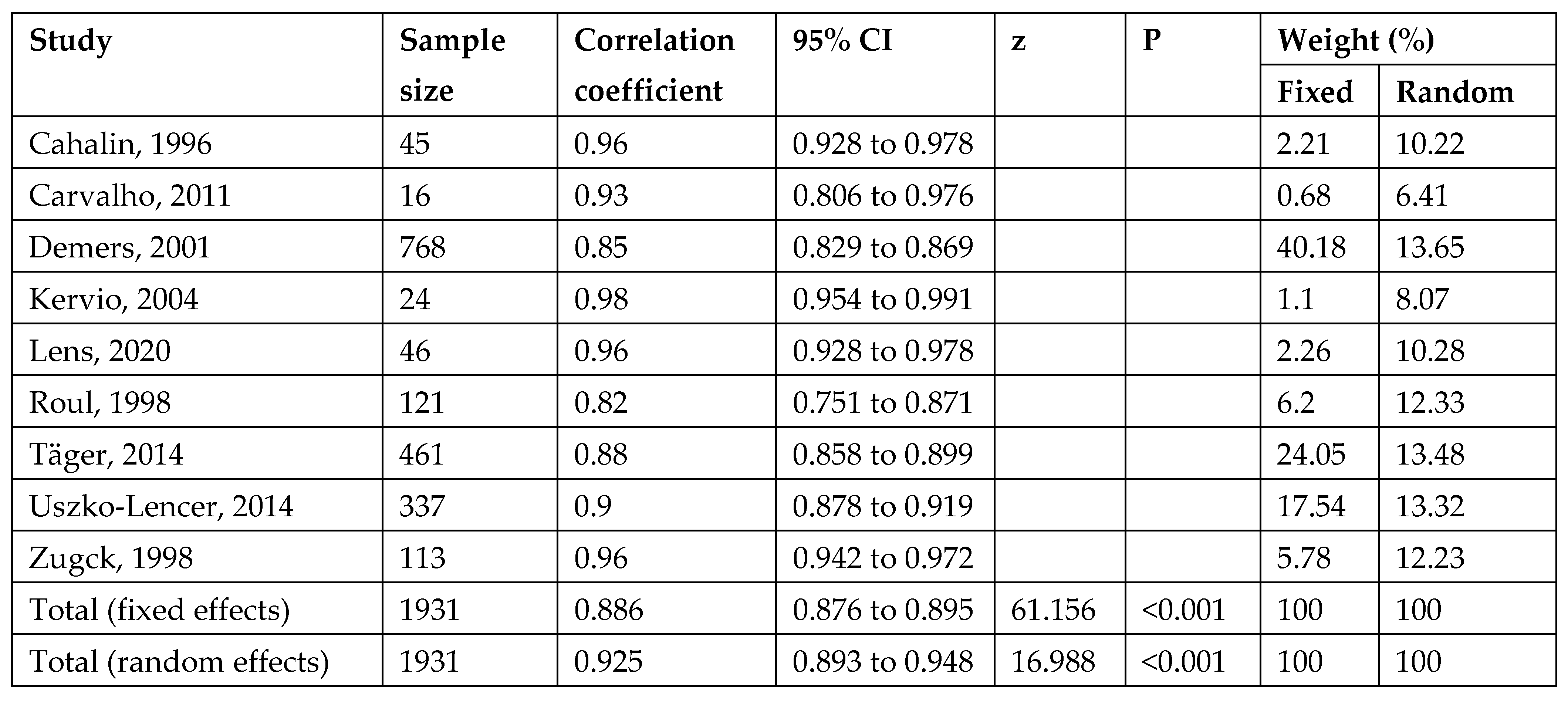 3.6. Meta-Analysis of Test–Retest Reliability of 6MWT