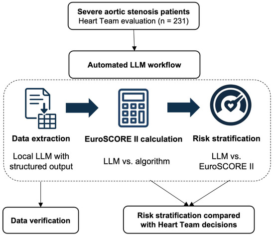 Study flowchart. Overview of the automated LLM workflow for severe aortic stenosis risk stratification. The process included data extraction using structured output LLM, EuroSCORE II calculation (LLM vs. algorithmic), and risk stratification (guideline-integrated LLM vs. EuroSCORE-based). All data were manually verified before comparison with Heart Team decisions (n = 231). LLM, large language model.
