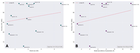 Local model accuracy for EuroSCORE II calculation according to model size and parameter count. (A) Scatter plot showing the relationship between model size in gigabytes (GB) and accuracy (defined as 100 minus mean absolute error) for EuroSCORE II calculation across 12 open-source language models. The red dashed line indicates linear regression fit. (B) Scatter plot showing the relationship between model parameter count (billions of parameters) and accuracy for the same models. The red dashed line indicates linear regression fit. LLM, large language model.