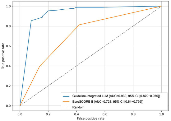 Accuracy performance of the guideline-integrated LLM compared to the EuroSCORE II method. Comparison of guideline-integrated LLM (AUC = 0.930, 95% CI [0.879–0.970]) versus EuroSCORE II (AUC = 0.723, 95% CI [0.641–0.799]) for risk stratification. The guideline-integrated LLM showed superior discriminative performance compared to EuroSCORE II-based classification (n = 231). AUC, area under the curve; CI, confidence interval; LLM, large language model.