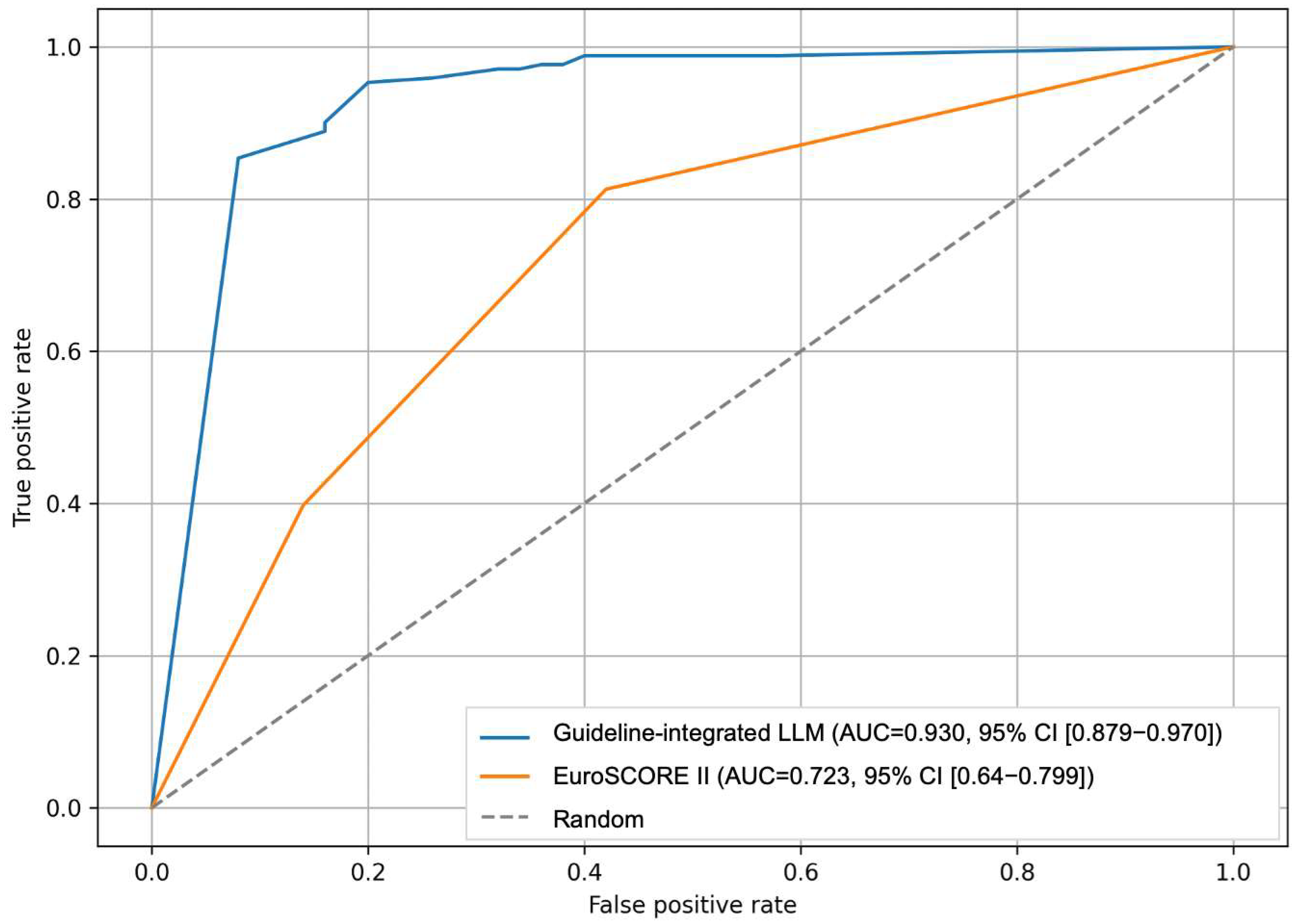 | Guideline-integrated LLM without EuroSCORE | 0.93 | 0.87–0.97 | 0.98 | 0.64 |