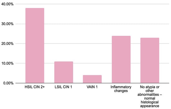 The histopathological examination results of women with abnormal cytology results (HSIL—75%, ASC-H—23%, and AGC—2%) were analyzed. HSIL/CIN 2+ was confirmed in 30 women (38%), while VAIN was diagnosed in 3 (4%). In 9 women (11%), histology revealed less severe lesions than suggested by cytology, specifically LSIL/CIN 1. The majority of patients (37 women; 47%) showed either inflammatory changes or no significant pathology. Notably, HSIL/CIN 2+ was most frequently observed in women with a cytological diagnosis of HSIL, whereas those with AGC predominantly exhibited LSIL or no atypia upon histological examination.