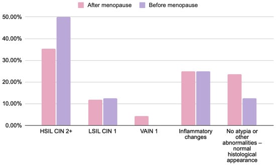 Across menopausal subgroups, the distribution of histopathological outcomes showed minor numerical variations that were not statistically significant. HSIL/CIN2+ was observed in 35% of postmenopausal and 50% of premenopausal women, whereas LSIL/CIN1 occurred with similar frequency in both groups (12% vs. 12.5%). VAIN1 lesions were only diagnosed in postmenopausal patients (4.5%). Inflammatory changes and the absence of atypia occurred at comparable rates between groups. These findings confirm that menopausal status did not significantly affect the concordance between cytological and histological results (p > 0.05).