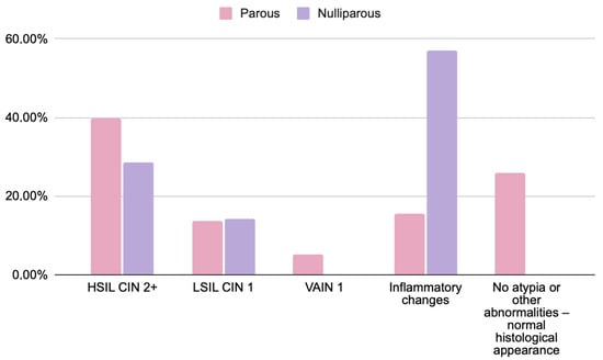 No statistically significant differences were found between parous and nulliparous women. While small numerical variations were noted (e.g., HSIL/CIN2+ observed in 39.5% vs. 29%), these results should be interpreted cautiously given the limited number of nulliparous participants. The frequency of inflammatory or low-grade lesions (LSIL, VAIN1) appeared comparable between groups.