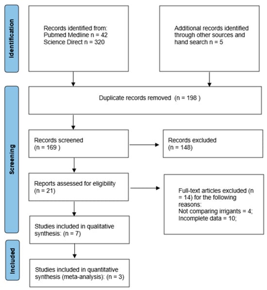 Of these, seven studies [,,,,,,] were included in the qualitative synthesis, three of which [,,] were also eligible for quantitative synthesis. Four of the included studies were excluded from the meta-analysis due to incomplete statistical data or incompatible outcome measures, resulting in the inclusion of only three studies in the pooled analysis. The remaining 14 studies were excluded because they did not meet the review objectives –specifically, four did not compare irrigation solutions and ten contained incomplete outcome data. A detailed flow of the search and selection process is presented in Figure 1.