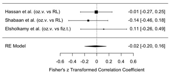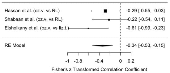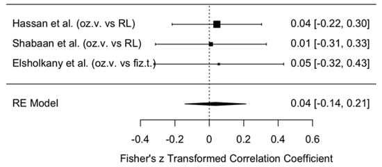 This forest plot illustrates the results of three studies (Hassan et al., Shabaan et al., Elsholkany et al. [,,]) and their summary estimate using a random effects (RE) model. All three studies reported very small effect sizes (0.03–0.07), with wide confidence intervals crossing zero. This indicates that, although the effect direction favored ozonated water (systematically higher MMO values in the ozonated water groups), the difference was not statistically significant.