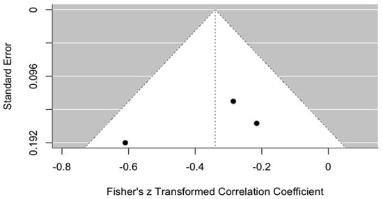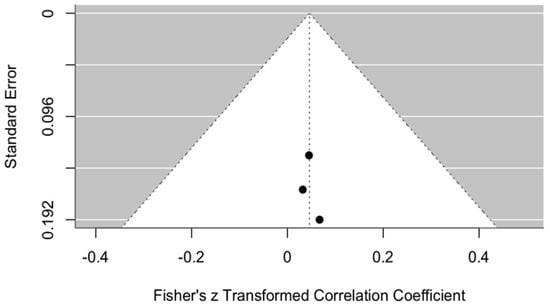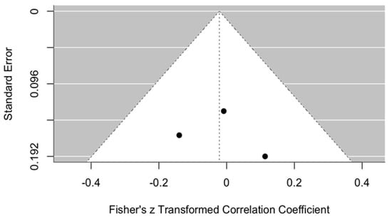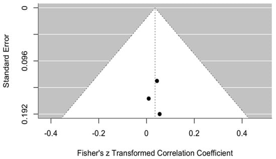 All points are located close to the central axis, suggesting no strong asymmetry that would indicate publication bias. In addition, the points are positioned relatively close to the top of the funnel, indicating that the standard errors of these studies are not large.