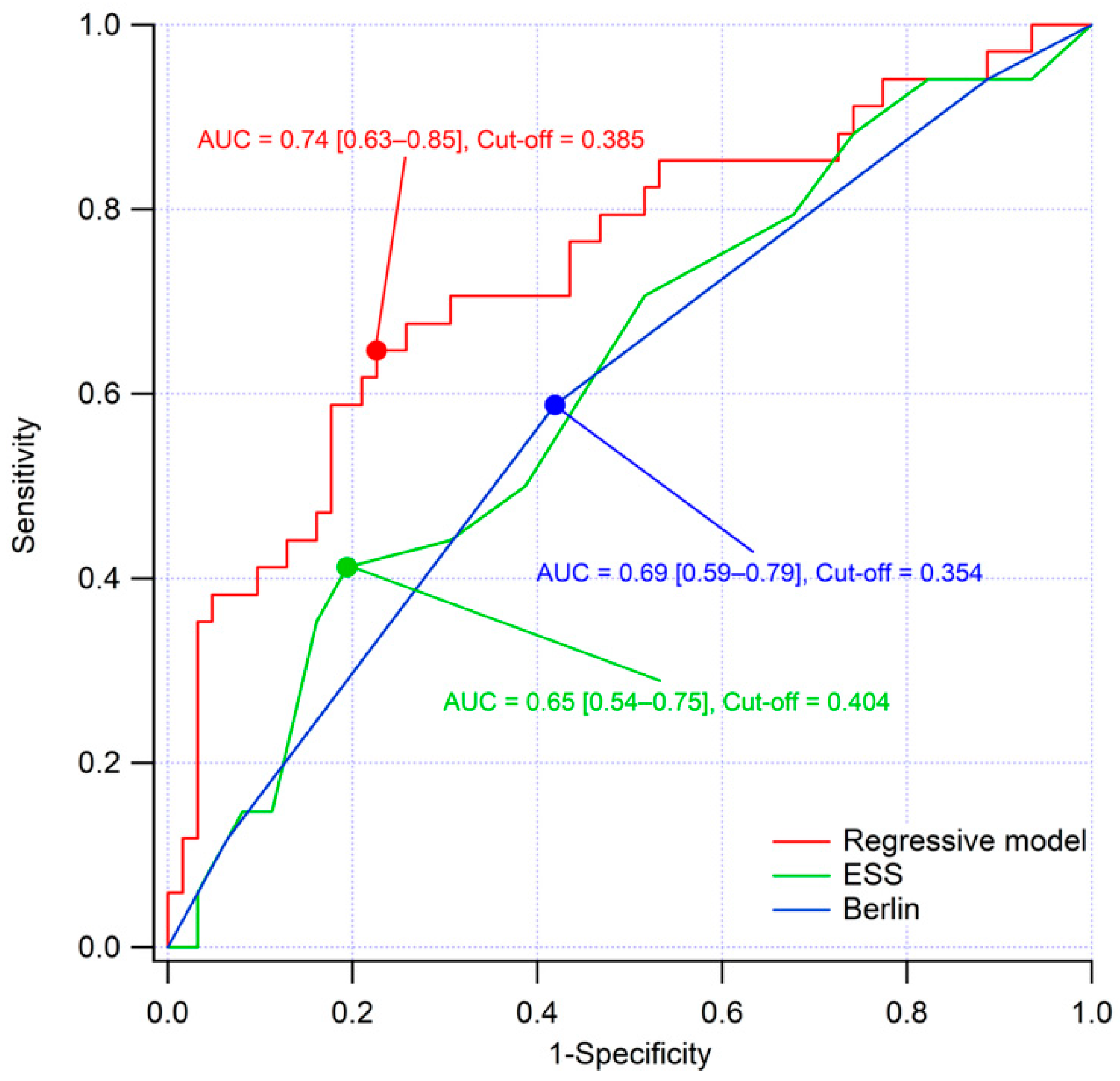 ROC curve analysis confirmed the discriminative ability of the model, with an AUC of 0.739 (95% CI 0.630–0.847; p < 0.001). In contrast, the Berlin Questionnaire (AUC = 0.596, p = 0.120) and the ESS (AUC = 0.616, p = 0.062) showed lower and non-significant accuracy (Figure 2). Overall, the proposed regression model outperformed both questionnaires in identifying OSA among stroke patients. At the optimal Youden-derived thresholds, the cut-offs were 0.4039 for ESS, 0.3537 for Berlin, and 0.3851 for the regression model. The regression model achieved the highest Youden index (J = 0.421) compared with ESS (J = 0.218) and Berlin (J = 0.169), confirming a superior discriminative ability and a more balanced trade-off between sensitivity and specificity. The corresponding performance metrics, including sensitivity, specificity, PPV, NPV, and accuracy, are reported in Supplementary Table S1.