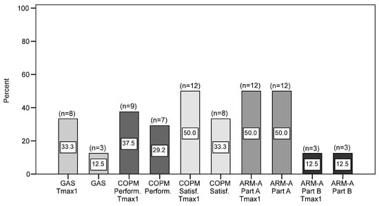 Clinically significant response rates at Tmax1 and T2 for GAS, COPM, and ARM-A (n = 24). GAS: Goal Attainment Scaling; COPM: Canadian Occupational Performance Measure; Perform.: Performance subscale; Satisf.: Satisfaction subscale; ARM-A: Arm Activity Measure; part A—passive function subscale; part B—active function subscale.
