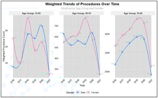 Analysis of procedure volumes from 2016 to 2021 revealed significant variations across age groups and years (p = 0.001), as illustrated in Figure 1. The majority of procedures were consistently performed in the 56–64 age group, with proportions increasing from 81.7% in 2016 to 88.3% in 2021. The 45–55 age group showed a steady decline in representation, decreasing from 16.8% in 2016 to 10.6% in 2021, while the 35–45 age group maintained relatively stable but low proportions (ranging from 0.98% to 1.87%). Procedure volumes showed positive year-over-year growth from 2016 through 2019, with increases of 16.4% (2016–2017), 11.9% (2017–2018), and 10.4% (2018–2019). However, a notable decline began in 2020 (−4.2%), followed by a substantial decrease in 2021 (−51.9%), likely reflecting the impact of the COVID-19 pandemic. Gender analysis revealed no significant differences in procedure distribution between males and females across the study period (p = 0.74), suggesting that access to procedures was not influenced by gender. Total procedure volumes peaked in 2019 (n = 2007) before declining to their lowest point in 2021 (n = 924).