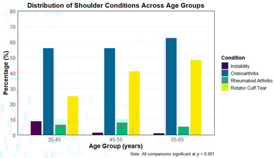 The distribution of clinical characteristics among patients undergoing RTSA varied significantly across age groups (35–45 years, 46–55 years, and 56–64 years). As presented in Figure 2, rotator cuff tears were increasingly prevalent with age, affecting 25% of patients in the 35–45 age group, 41.2% in the 46–55 group, and 48.5% in the 56–64 group (p < 0.001). Notably, traumatic indications both acute and chronic were rare across all age groups in this cohort. This is unexpected given that trauma-related pathology is often more common among younger and more active patients, whereas osteoarthritis typically predominates in older adults. The low observed frequency likely reflects coding patterns in the NIS and the predominance of degenerative indications for RTSA during the study period. Conversely, rheumatoid arthritis was most prevalent in the 45–55 age group (8.0%) compared to 6.6% and 5.4% in the youngest and oldest groups, respectively (p = 0.001). Osteoarthritis was the most common indication overall, with rates increasing significantly with age: 56.6%, 56.0%, and 62.5% in the respective age groups (p < 0.001). Instability was more frequently observed in the youngest cohort (8.8%) compared to 1.4% and 1.1% in the older groups (p < 0.001). These findings highlight notable variations in the underlying indications for surgery across different age demographics (Table 4).