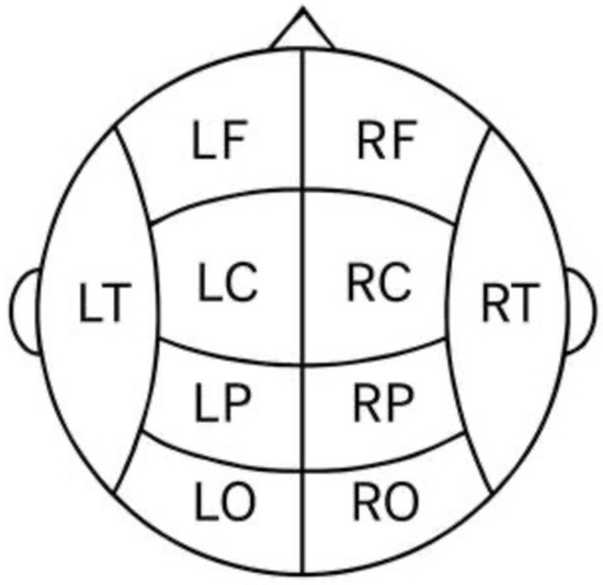 This schematic illustration provides a simplified representation of the regional classification of electrodes used in EEG analysis. The organization enables group-level analyses based on the functional and anatomical divisions of the cerebral hemispheres. Each regional abbreviation (e.g., LF, RP, LO) corresponds to specific electrode clusters, which were employed for both spatial (intra- and interhemispheric concordance) and temporal (first baseline vs. second time point concordance) analyses.