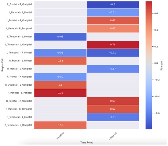 Correlation analysis: To examine relationships between different regions and their stability over time, we computed Pearson correlation matrices for the theta cordance values. Separate correlation analyses were carried out for Baseline and Follow-up measures. In particular, we were interested in inter-hemispheric correlations (e.g., left vs. right homologous regions) and intra-hemispheric cross-region correlations (e.g., frontal vs. temporal within the same hemisphere) at each time point. Additionally, we explored whether baseline cordance values predicted follow-up values. For the three midline electrodes, we calculated Pearson partial correlation coefficients between Baseline and Follow-up cordance, controlling for the length of the follow-up interval (in years). This partial correlation accounts for variability in time between measurements when assessing the stability of individual differences in cordance. Correlation coefficients with p < 0.05 were considered significant, with a Bonferroni correction applied within each matrix to control for multiple comparisons as appropriate.