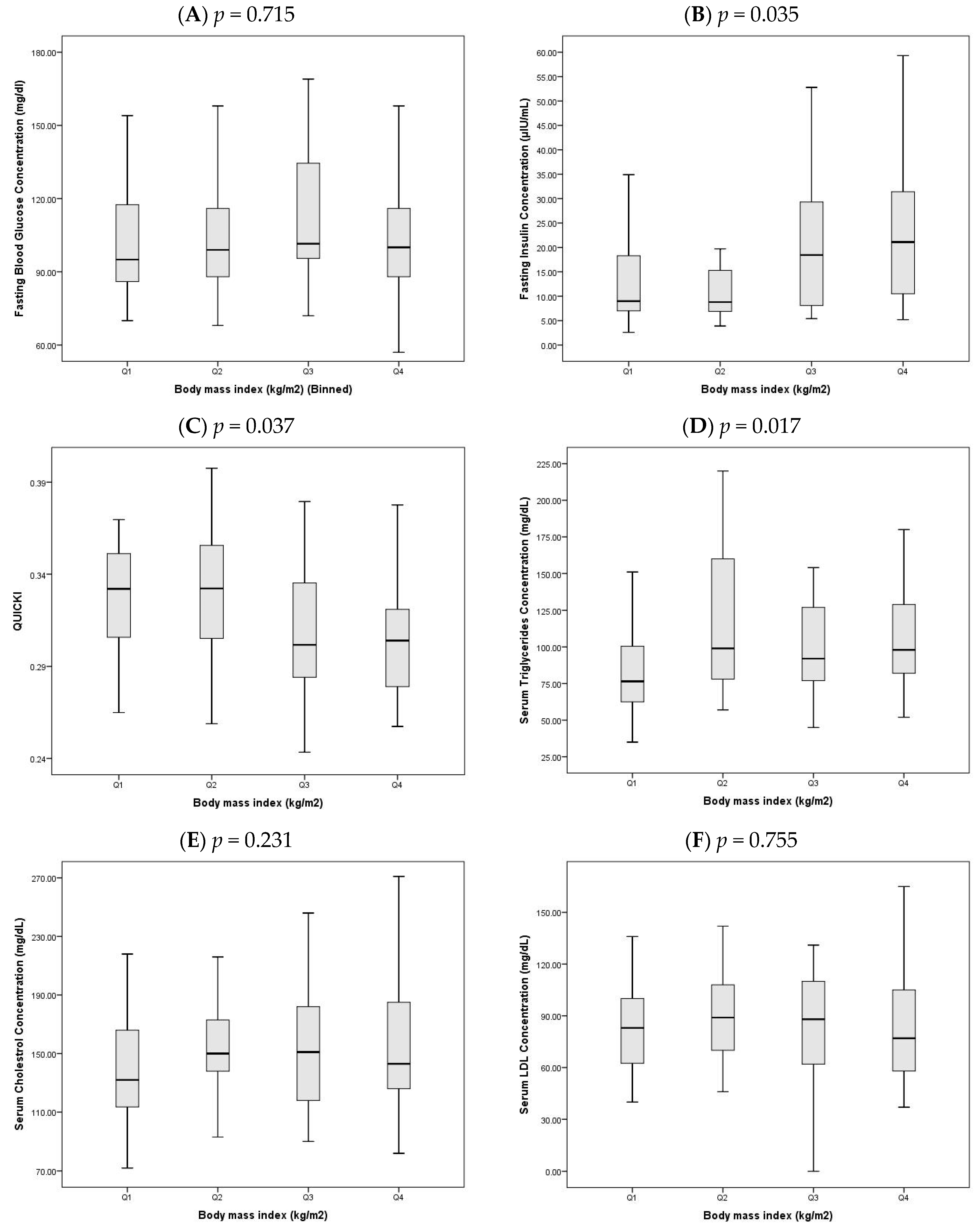 Figure 1C), from 0.33 (0.30–0.35) in Q1 to 0.30 (0.28–0.32) in Q4, reflecting a decline in insulin sensitivity with increasing BMI.