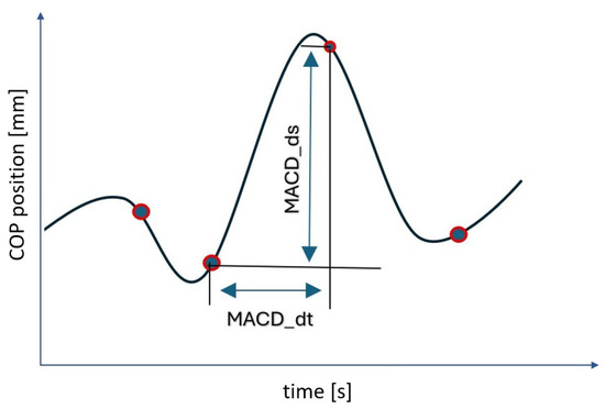 COP displacement signal with marked selected values calculated for two subsequent values of trend change points detected by the algorithm. Legend: MACD_dt—time value between subsequently detected points of a trend change in the COP course; MACD_ds—displacement between subsequent points of the trend change; blue dots—the blue dots correspond to the locations on the COP trajectory where a trend change was detected.