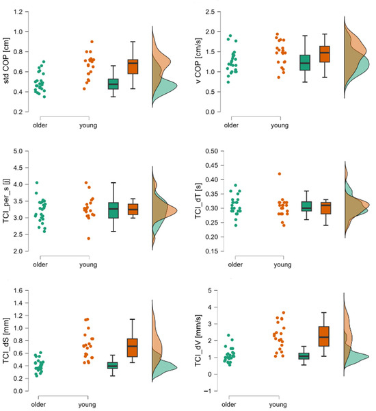 Raincloud plots for stdCOP, vCOP, TCI per_s, TCI_dT, TCI_dS, and TCI_dV. The dot plot represents individual subjects, the box plot shows mean values and confidence intervals, and the distributions correspond to registered data from young and older subjects during the first phase of the Tiptoe Rising Test, corresponding to quiet standing. Legend: stdCOP—standard deviation of COP, TCI_per_s[j]—trend change index per second, TCI_dS—mean displacement between trend changes, TCI_dT—mean time between trend changes, TCI_dV—mean velocity between trend changes, vCOP—velocity of COP.