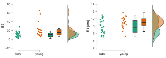Raincloud plots for B2 and R1. The dot plots represent individual subjects, the box plots show mean values and confidence intervals, and the distributions correspond to data collected from young and older subjects during the second phase of the Tiptoe Rising Test, corresponding to rising onto the toes. Legend: B2—regression line coefficient for Phase II limit of stability test, indicating the speed of leaning forward, R1—limit of stability range calculated from the mean COP position.