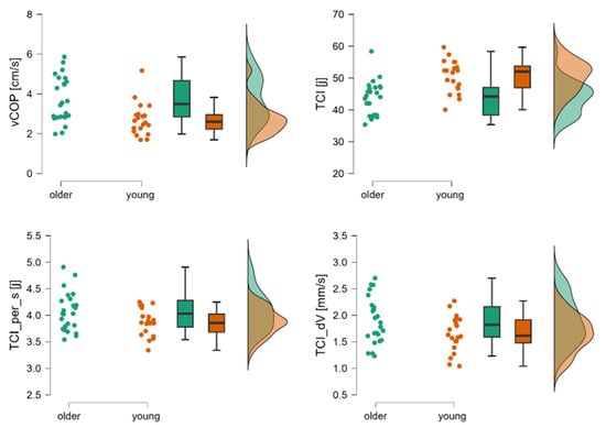 Raincloud plots for vCOP, TCI, TCI per_s, and TCI_dV. The dot plot represents individual subjects, the box plot shows mean values and confidence intervals, and the distributions correspond to registered data from young and older subjects during the third phase of the Tiptoe Rising Test, corresponding to quiet standing. Legend: TCI [j]—total number of trend changes during the whole test, TCI_per_s[j]—trend change index per second, TCI_dV—mean velocity between trend changes, vCOP—velocity of COP.