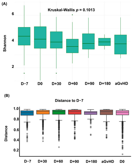 Dynamics of Alpha and Beta Diversity over the allo-HSCT. (A) Shannon Index over the allo-HSCT. (B) Bray–Curtis dissimilarity relative to pre-conditioning sample (D − 7). Each box represents the distribution of dissimilarities across patients at each time point. Higher distances indicate greater shifts in microbiota composition relative to baseline. aGvHD = acute graft versus host disease; D = Day.