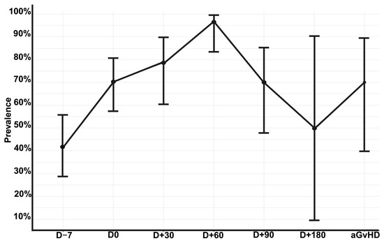 Prevalence of intestinal domination by any genus over the allo-HSCT. Error bars representing 95% confidence interval calculated using the Wilson score method for proportions to account for small sample sizes at late time points. Allo-HSCT = Allogeneic hematopoietic stem cell transplantation. aGvHD = acute Graft-versus-Host Disease; D = Day. Edited with BioRender.com, Soares Ferreira Junior A. (2025) https://BioRender.com/zd0vcep (accessed on 3 November 2025).