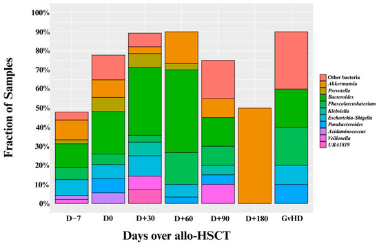 Proportion of intestinal domination events by specific genera over the allo-HSCT. Allo-HSCT = Allogeneic hematopoietic stem cell transplantation. Edited with BioRender.com, Soares Ferreira Junior A. (2025) https://BioRender.com/xzrbtuf (accessed on 3 November 2025).
