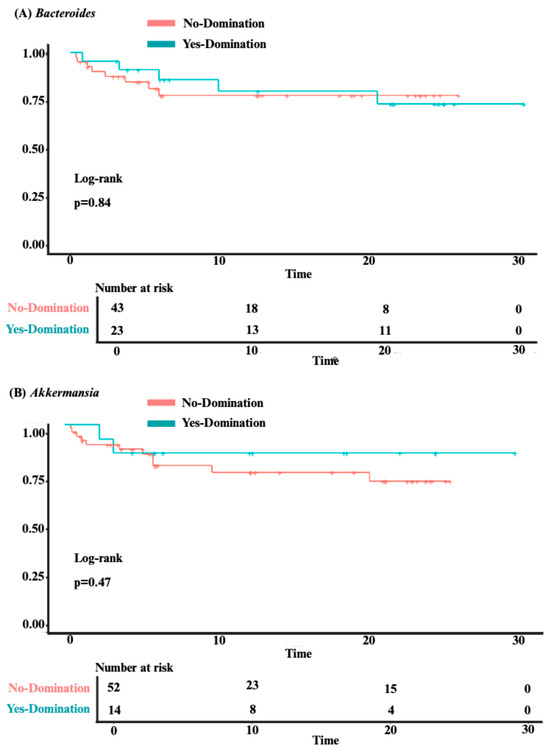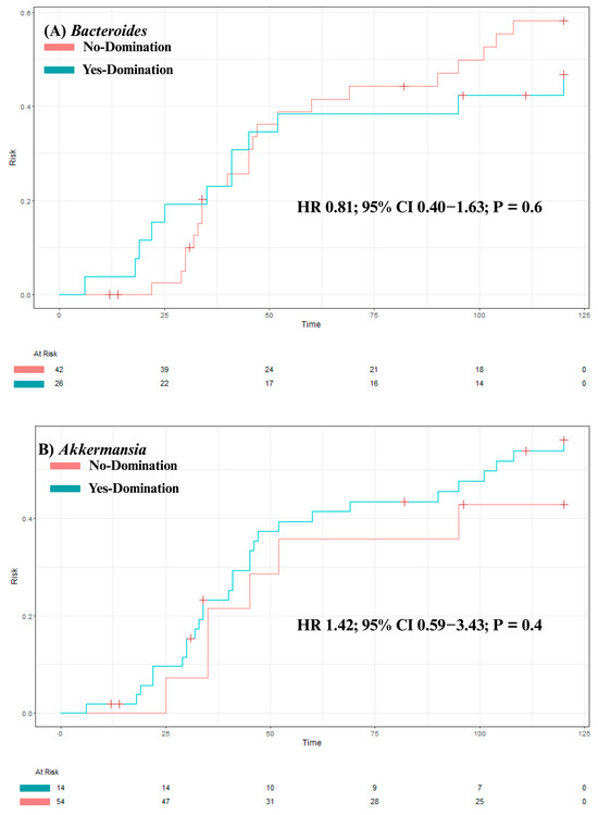 Our findings identified that important genera driving intestinal domination in Brazilian patients are Bacteroides, Akkermansia, Phascolarctobacterium, and Escherichia-Shigella. In our cohort, these four genera were responsible for most of the domination events. While Bacteroides and Akkermansia have been reported as dominant genera in prior studies, the high frequency of Phascolarctobacterium and Escherichia-Shigella domination is not well demonstrated in the prior literature [9,19,20,21,22,23,24]. The dynamics of intestinal domination was evaluated in 100 patients with 603 stool specimens [19]. This study demonstrated an interesting compositional shift [19]. While Bacteroides was the most common dominant genus before conditioning, at the time of engraftment, intestinal domination occurred predominantly due to pathogenic genera such as Enterococcus, Klebsiella and Escherichia-Shigella [19]. In another study including 98 patients undergoing allo-HSCT, 681 stool specimens were analyzed [24]. The most frequent genera responsible for intestinal domination, in decreasing order, were as follows: (1) Streptococcus (42%), (2) Enterococcus (36%), and (3) Bacteroides (38%) [24]. Other important dominant genera reported in this study were Akkermansia, Blautia and Lactobacillus, each of which was associated with intestinal domination in approximately 28% of patients. A similar profile was also identified in another study including 94 patients with 439 stool specimens [23]. In this study, Enterococcus was the most frequent dominating genus (40%), followed by Streptococcus (37%) [23]. When compared to these previous studies, our findings suggest that Brazilian patients undergoing allo-HSCT may exhibit a unique intestinal domination fingerprint.