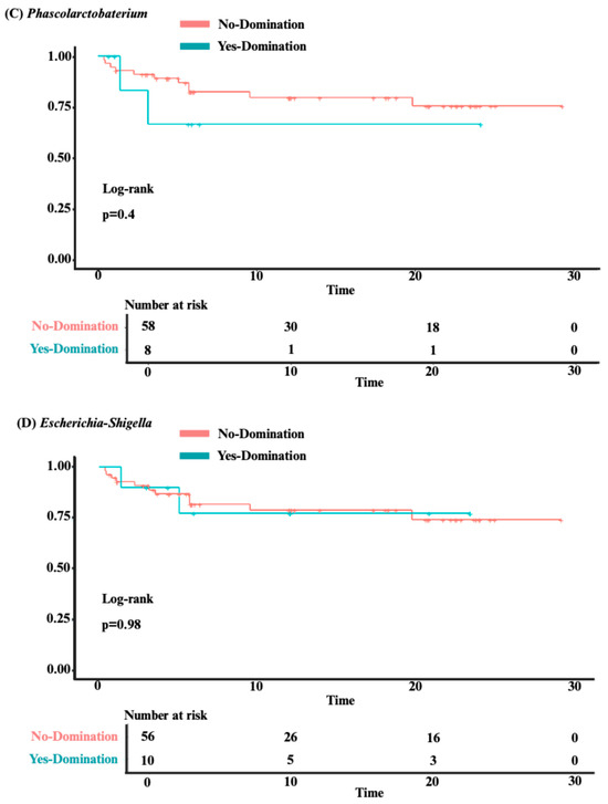 Across different cohorts, understanding how these distinct domination fingerprints may have prognostic significance is a key step to optimizing stratification and intervention strategies. Nevertheless, the available evidence has largely been focused on Enterococcus domination [20,21,22,23,24]. For instance, Enterococcus domination has been linked to significantly reduced overall survival, GvHD severity, and increased risk of bloodstream infections (BSI) [21,23,24]. However, how other dominant genera may impact clinical outcomes remains poorly understood.