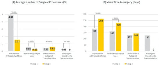 The rate of knee replacement arthroplasty was significantly lower in group 2 (2.31%) than in group 1 (4.92%) (p < 0.0001). Furthermore, the mean time to surgery was markedly longer in Group 2 (252.0 days; 95% CI, 244.4–259.6) than in Group 1 (176.6 days; 95% CI, 173.6–179.5) (p < 0.0001). Similar trends were observed for hemiarthroplasty, with group 2 showing a lower incidence than group 1 (0.55% vs. 0.28%, p < 0.0001) and delayed surgery (162.2 vs. 240.7 days, p < 0.0001).