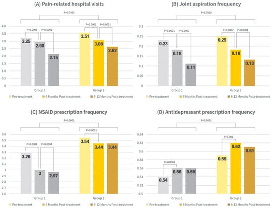 Pain-related hospital visits, NSAID and antidepressant prescriptions, and joint aspiration counts were compared within Group 1 and Group 2 in timely order after PN injection, which is shown in Figure 3 and Supplemental Tables S2–S5.