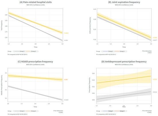 Trends in 4 clinical outcomes before and after IA PN injection across treatment groups. Trends in four clinical indicators were analyzed over time to assess symptomatic changes within each treatment group (Group 1: single-cycle; Group 2: re-administration group). Differences in slopes estimated from linear regression models between the two groups. (A) Pain-related hospital visits (B) Joint aspiration frequency (C) NSAID prescription frequency (D) Antidepressant prescription frequency. Exact numerical values are shown in Supplemental Table S6.