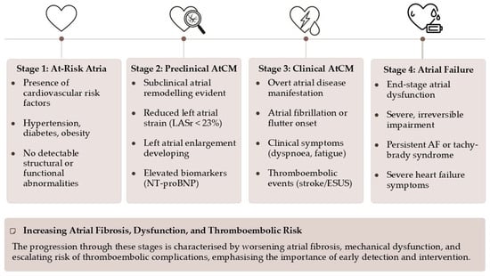- Stage 2 (Preclinical AtCM): This stage marks the onset of subclinical atrial remodeling. Structural and/or functional abnormalities are now detectable via imaging (e.g., atrial enlargement, reduced strain) or elevated biomarkers (e.g., NT-proBNP), but the patient remains asymptomatic and without a history of atrial arrhythmias or thromboembolism.