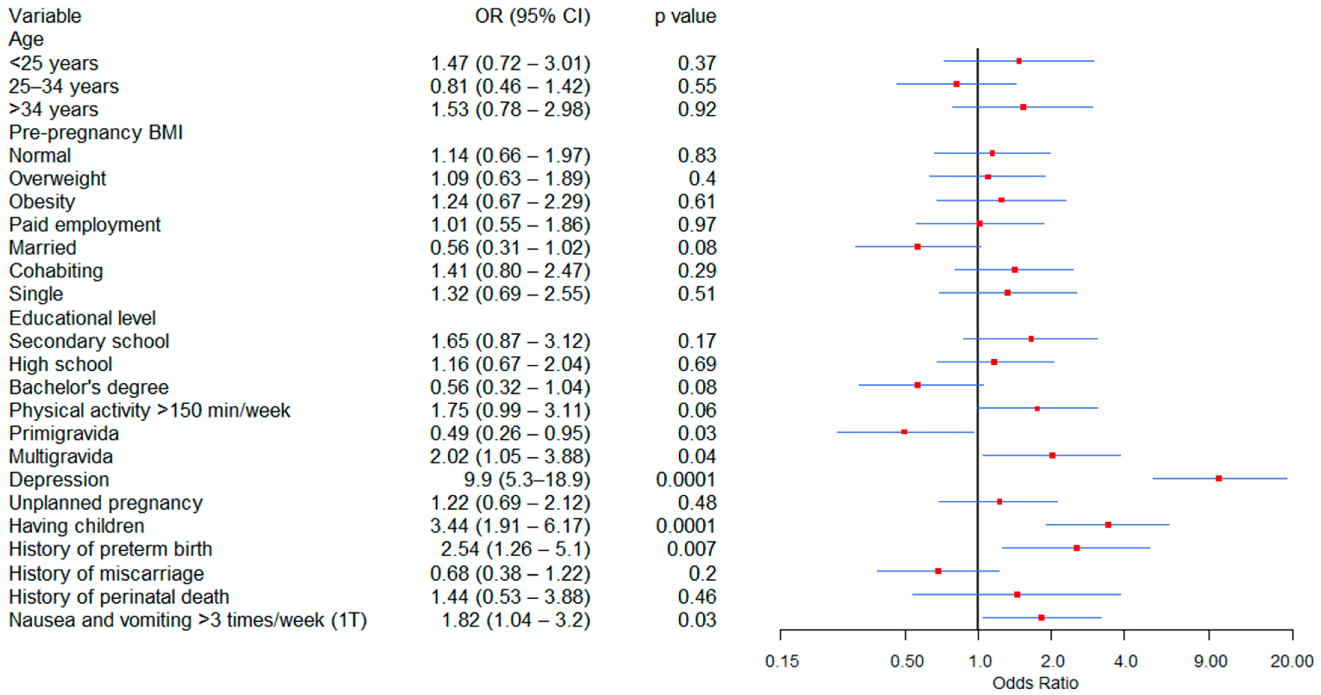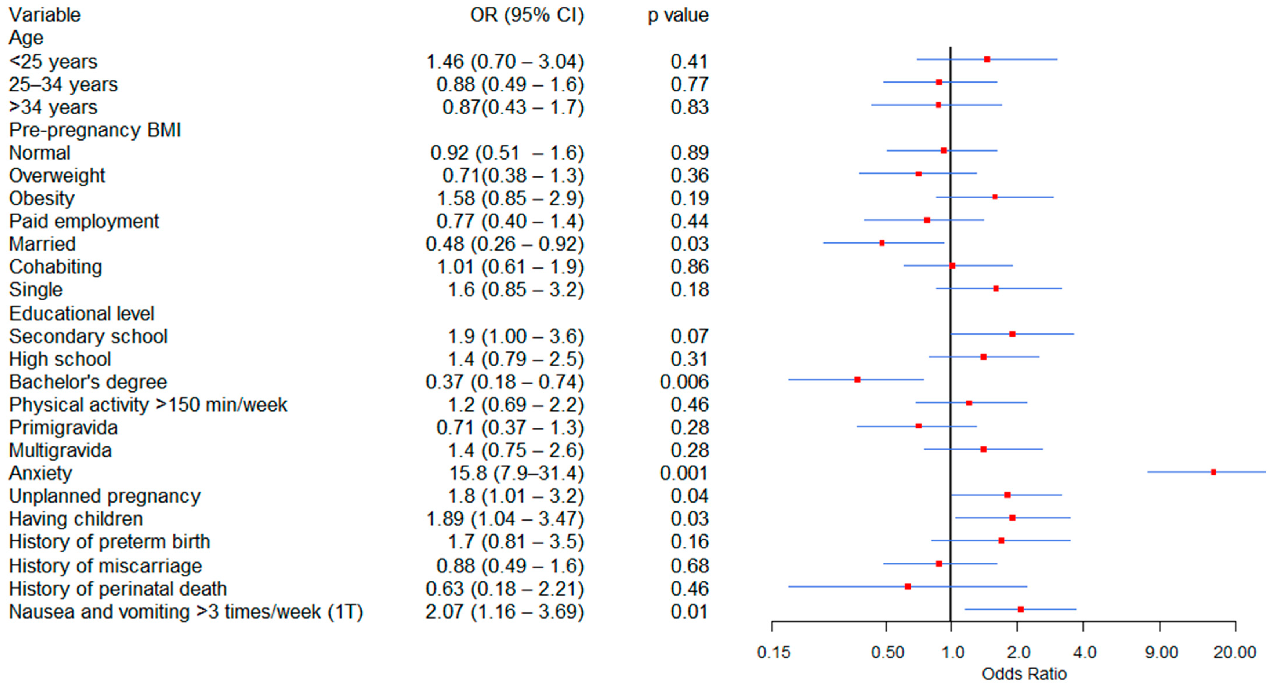 | Nausea and vomiting > 3 times/week (1T) | 0.444 | 0.25 | 1.55 (0.72–3.35) |