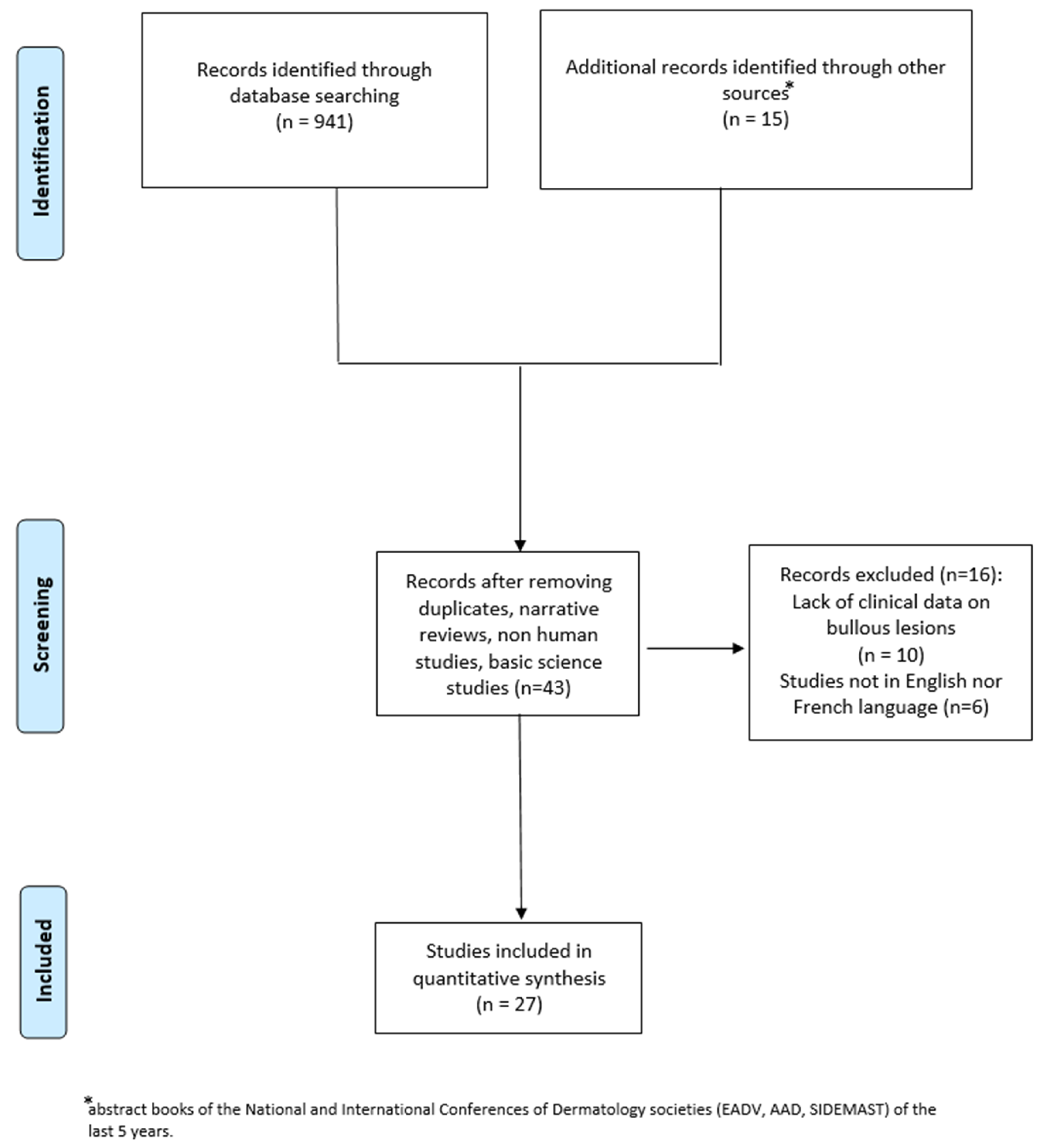 After reviewing the titles and abstracts of 956 articles from our initial search, we excluded 913 papers (duplicates, narrative reviews, non-human studies, basic science studies). After reviewing the full text of the remaining 43 articles, ten were excluded because they lacked detailed clinical data on bullous lesions, and six were not in English or French. We therefore analyzed 28 patients, including the case we described herein [3,5,7,8,9,10,11,12,13,14,15,16,17,18,19,20,21,22,23,24,25,26,27,28]. Clinical, laboratory, and histological features and treatments of the collected cases are summarized in Table 1.