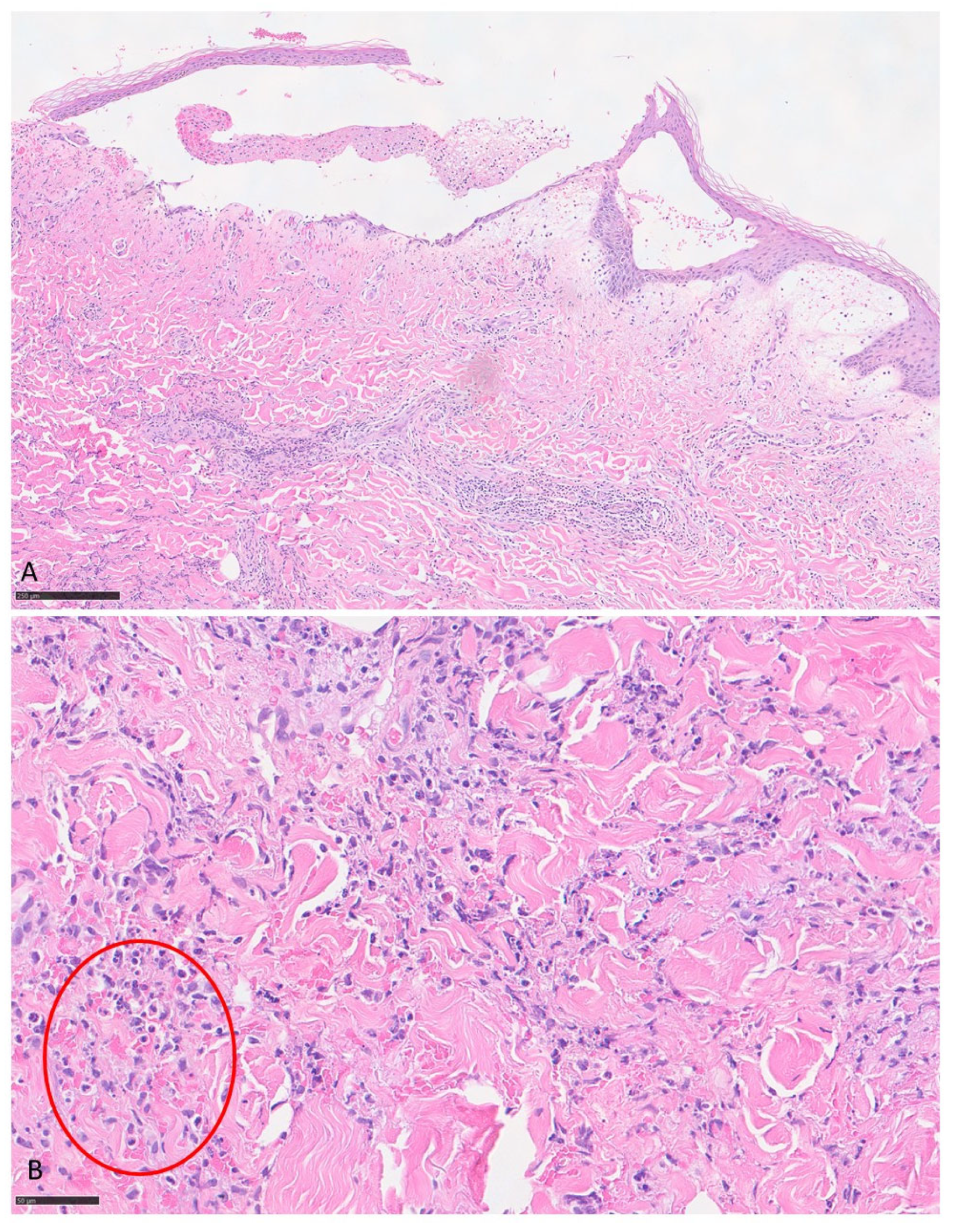 Figure 4. (A) Histology showed keratinocyte detachment in the spinous layer of the epidermis with formation of a fibrin-granulocytic eosinophilic blister (Hematoxylin-Eosin, 10× magnification); (B) a marked chronic lympho-eosinophilic inflammatory infiltration was observed in the perivascular area of the superficial and deep dermis (Hematoxylin-Eosin, 40× magnification); “flame figures” correspond to an amorphous eosinophilic structure composed of proteinaceous material and cellular debris, surrounded by degenerated eosinophils and histiocytes (red circle).