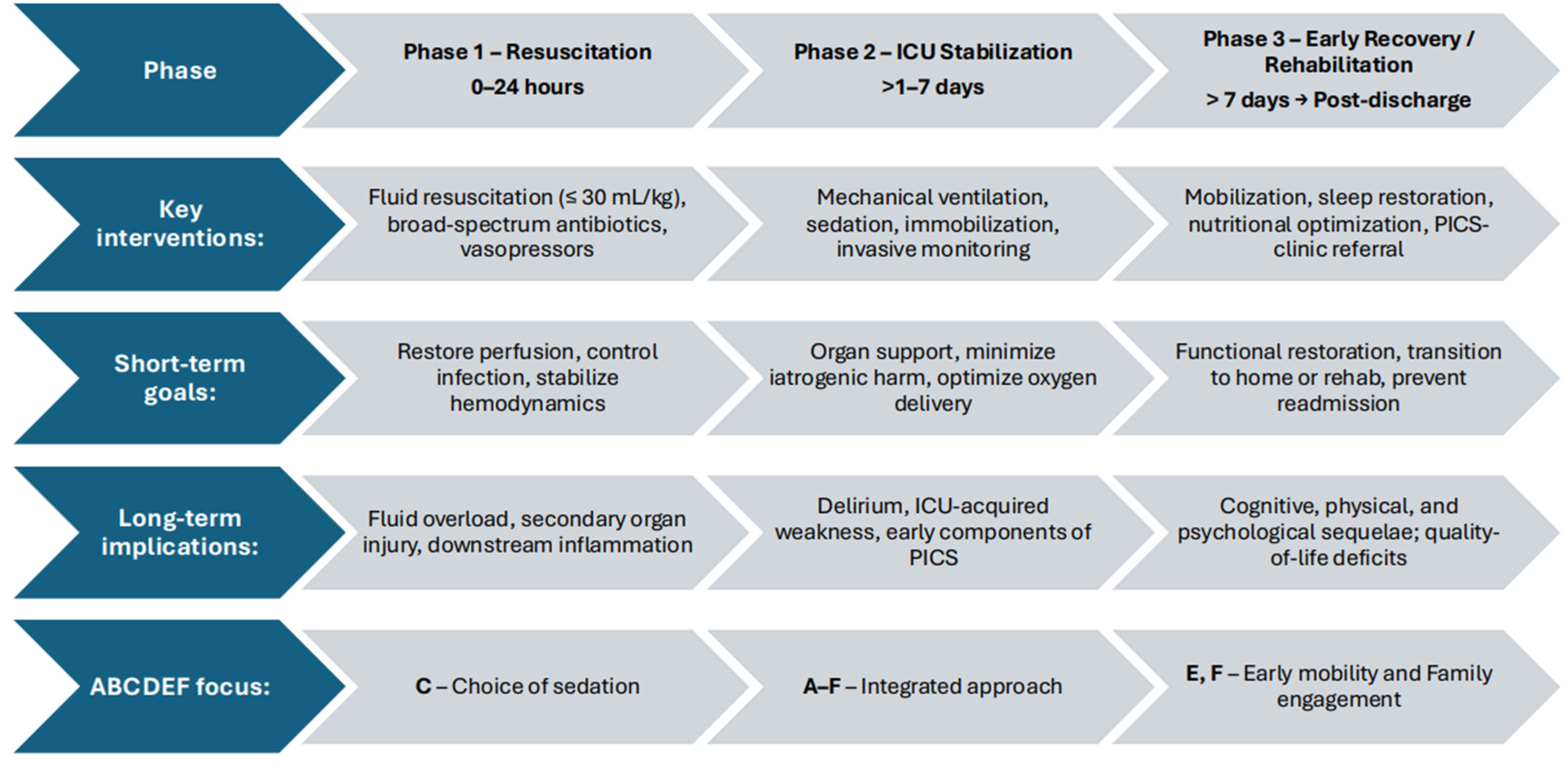 Sherman, M.; Lim, P.; Cheema, T.; DiSilvio, B.; Tiberio, P. From Resuscitation to Rehabilitation: The Post-Intensive Care Syndrome Continuum in Sepsis Care. J. Clin. Med. 2025, 14, 8374. https://doi.org/10.3390/jcm14238374