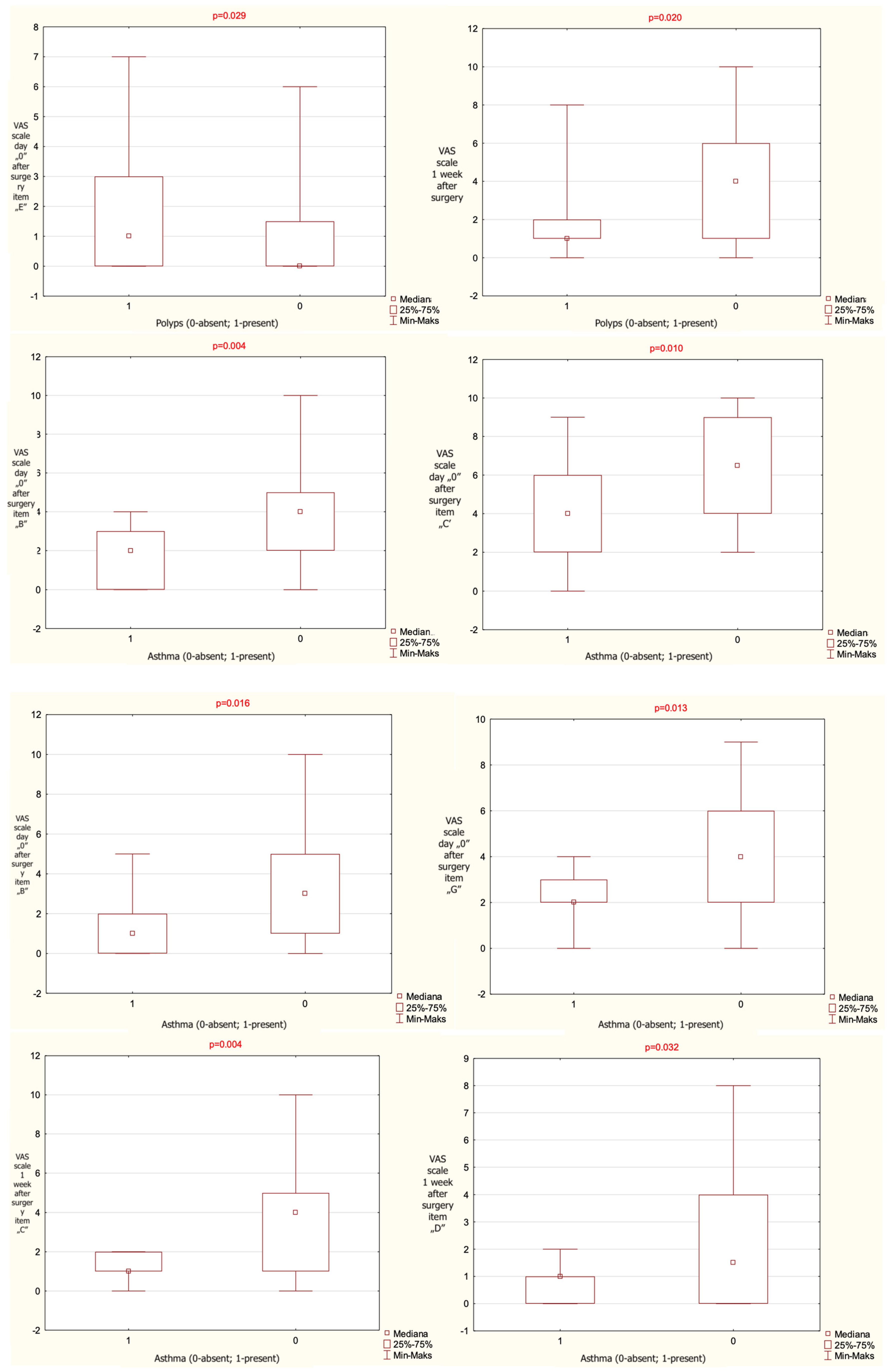 The results given as mean value, range and median, observed for the entire cohort regarding VAS items significant statistically and presence or absence of polyps on nasal endoscopy and asthma, noted on the day of surgery and 1 week after surgery (p-level of statistical significance). VAS—Visual Analogue Scale.