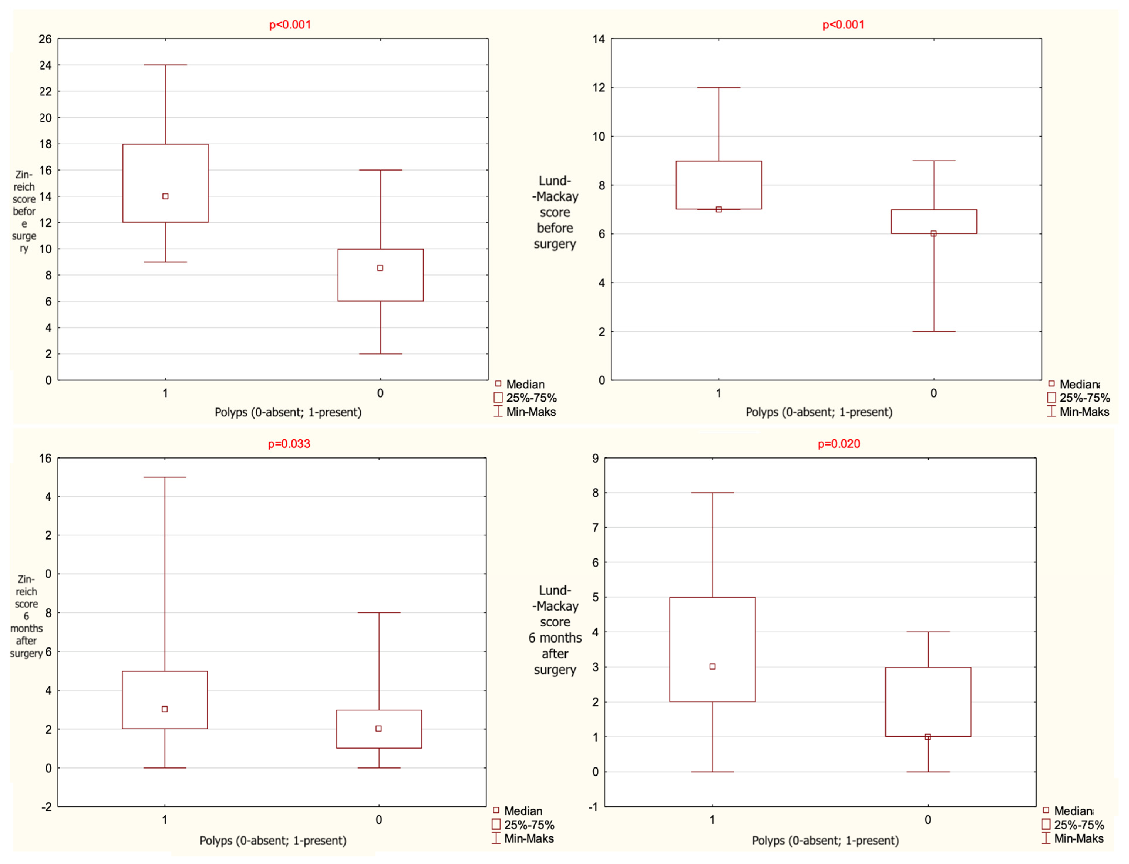 A statistically significant association was found between Zinreich CT scores and the presence of nasal polyps. Patients without polyps had significantly lower Zinreich scores both preoperatively and 24 weeks postoperatively. A similar relationship was observed for Lund–Mackay scores. The statistical data are given in